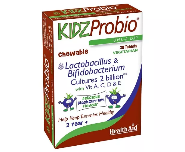 KidzProbio Chewable Tablets is a unique formulation containing special viable strains of Lactobacillus and Bifidobacterium designed with your child’s wellbeing in mind. Together with the added benefits of Vitamin A, C, D and E; KidzProbio helps keep the digestive system in balance, provides essential support under conditions of digestive disorders, helps regain flora balance following antibiotic therapy, and promotes healthy growth and development. HealthAid uses special acid & bile resistant strains, which prevent the stomach juices destroying the ingredients before they reach the intestines, ensuring their purity and potency. KidzProbio comes in a great blackcurrant flavour which children will enjoy!