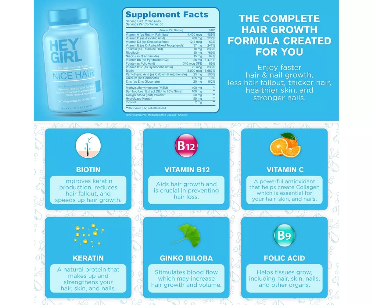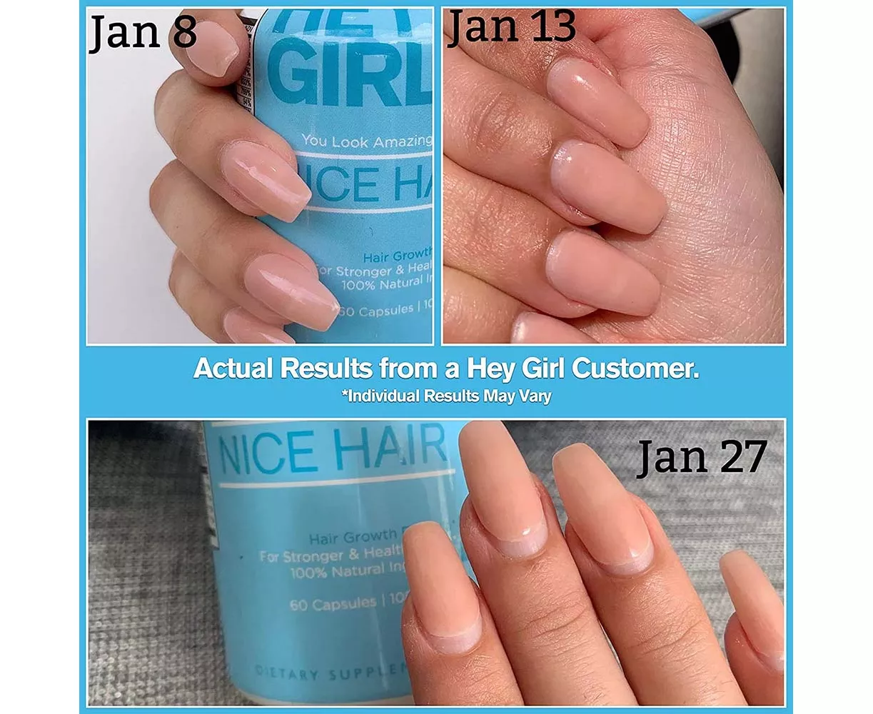 All it takes is 2 capsules a day after a meal. It's not miracle pills. Nothing will happen overnight. You have to stay consistent with it daily and watch good things happen FYI, our supplement was made by a woman for women because we know best! The nice hair supplement is also good for your skin and nails because we know it's important for women to have pretty nails and skin that glows. We gotchu girl!