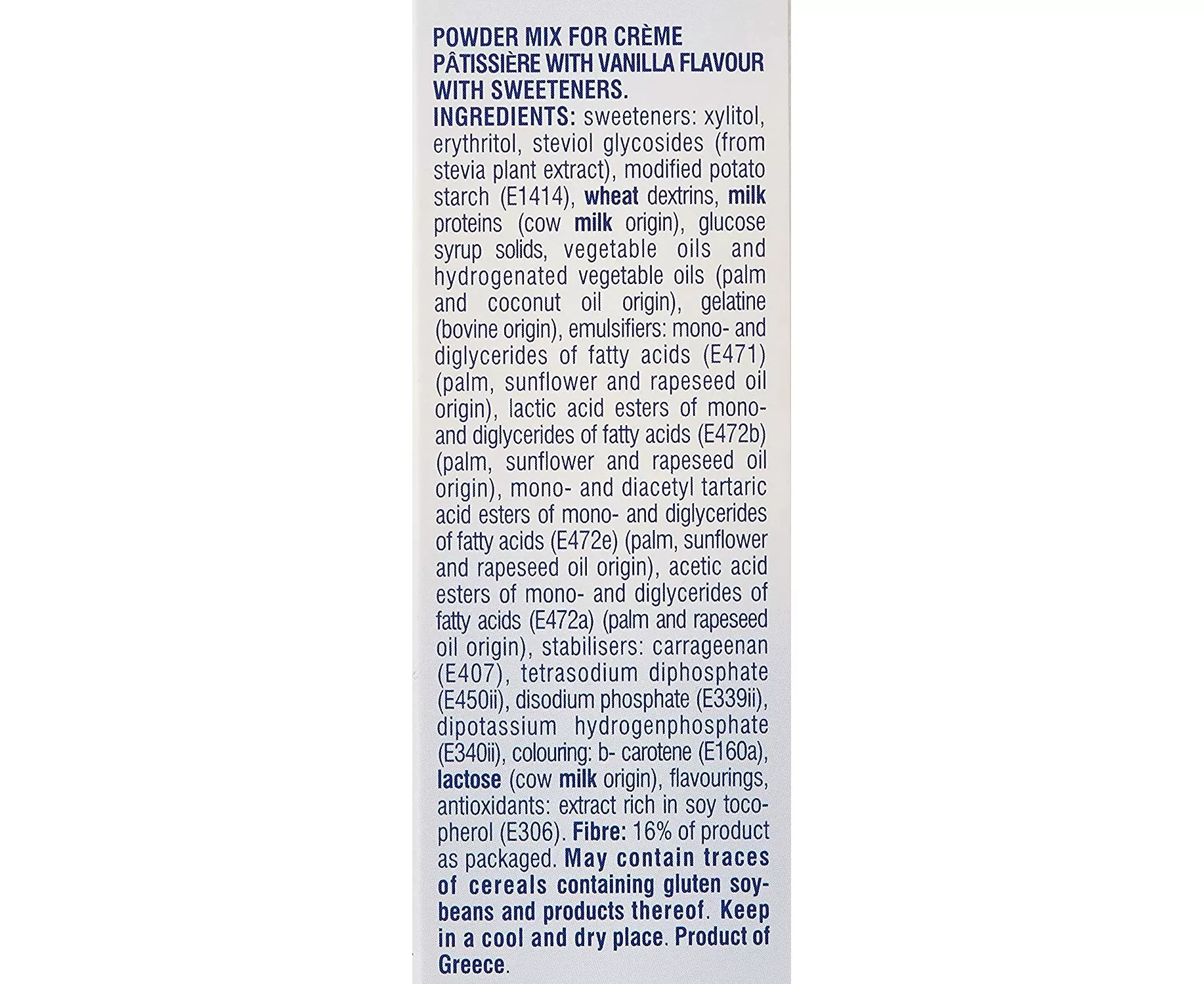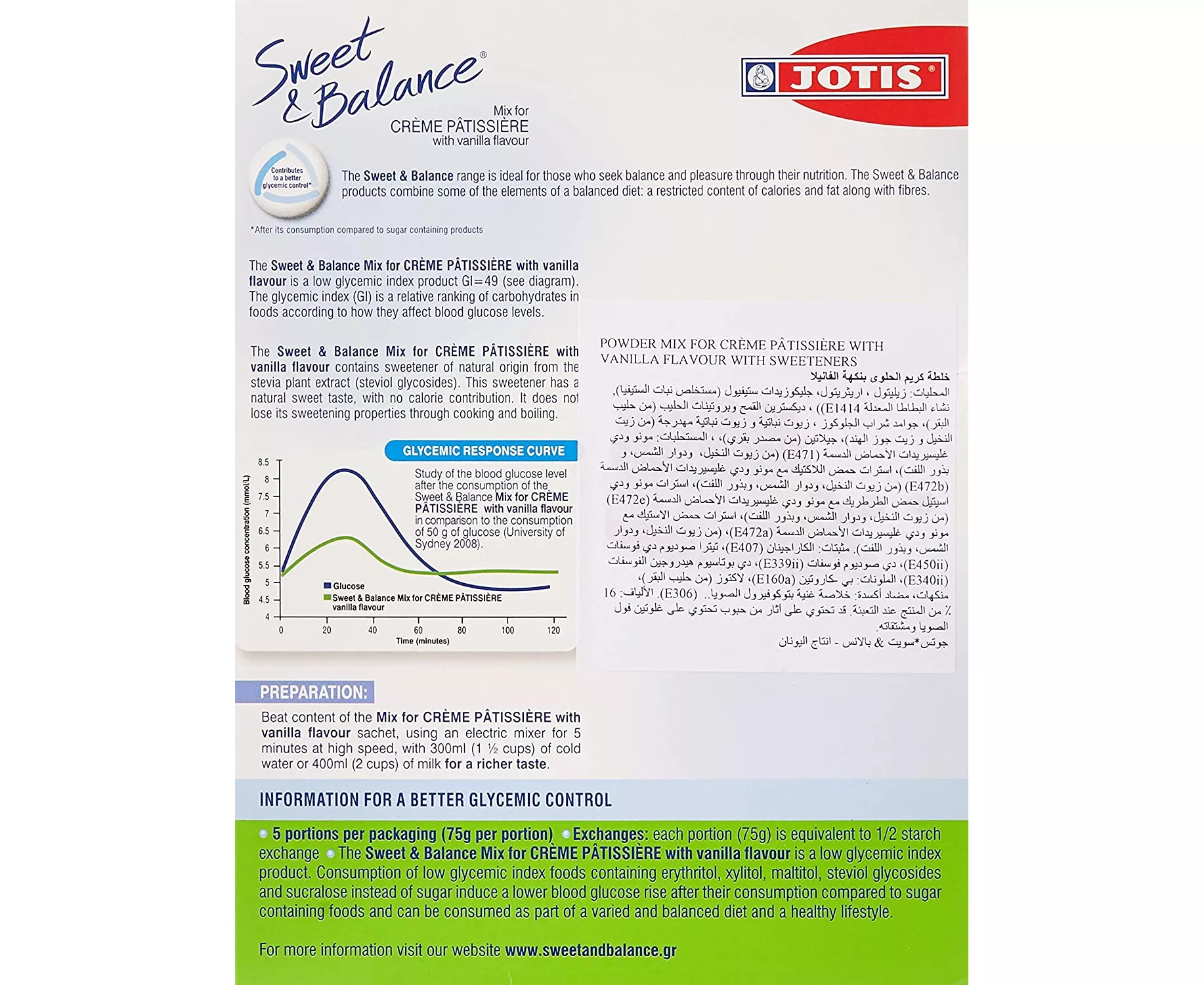 The Sweet and Balance range is ideal for those who seek balance and pleasure through their nutrition. The Sweet and Balance products combine some of the elements of a balanced diet: a restricted content of calories and fat along with fibres. Sweet and Balance Crème Patisserie with Vanilla flavour is a very low glycaemic index product. The Glycaemic Index (GI) is a relative ranking of Carbohydrates in foods according to how they affect blood glucose levels. Sweet and Balance Crème Patisserie with Vanilla flavor contains sweetener of natural origin from the stevia plant (Ste viol glycosides). This sweetener has a natural sweet taste, with no calorie contribution. It does not lose its sweetening properties through cooking and boiling.