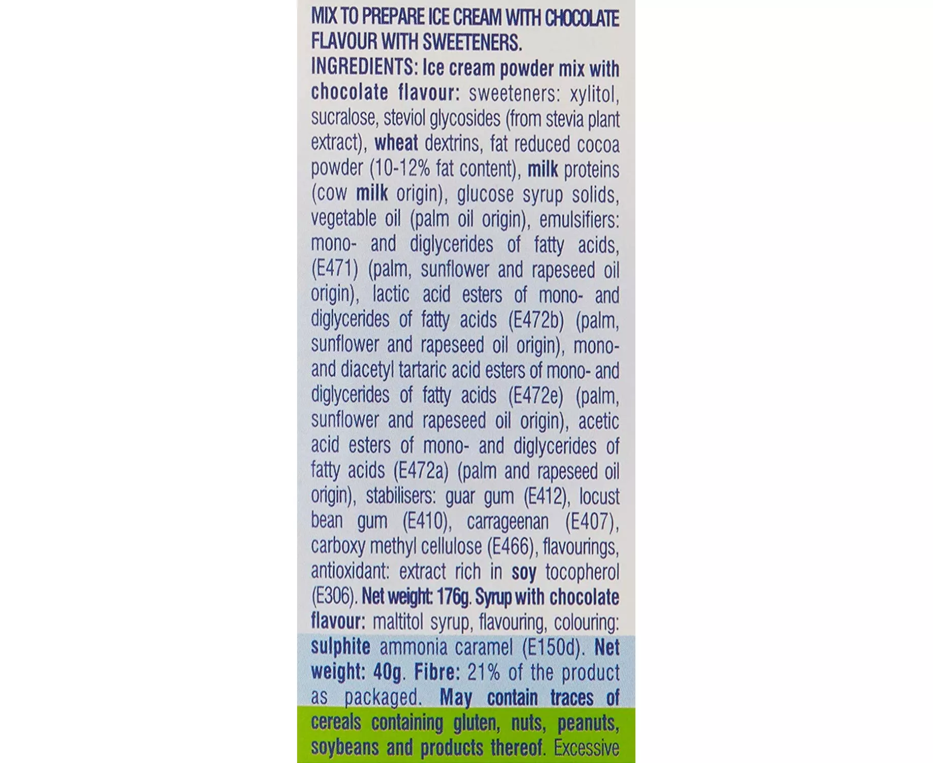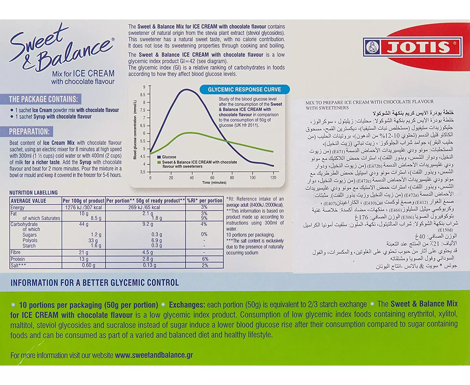 The Sweet and Balance Ice Cream with Chocolate flavor contains sweetener of natural origin from the stevia plant (Ste viol glycosides). This sweetener has a natural sweet taste, with no calorie contribution. It does not lose its sweetening properties through cooking and boiling. Sweet and Balance Ice Cream with Chocolate flavor is a very low glycemic index product. The Glycemic Index (GI) is a relative ranking of Carbohydrates in foods according to how they affect blood glucose levels.