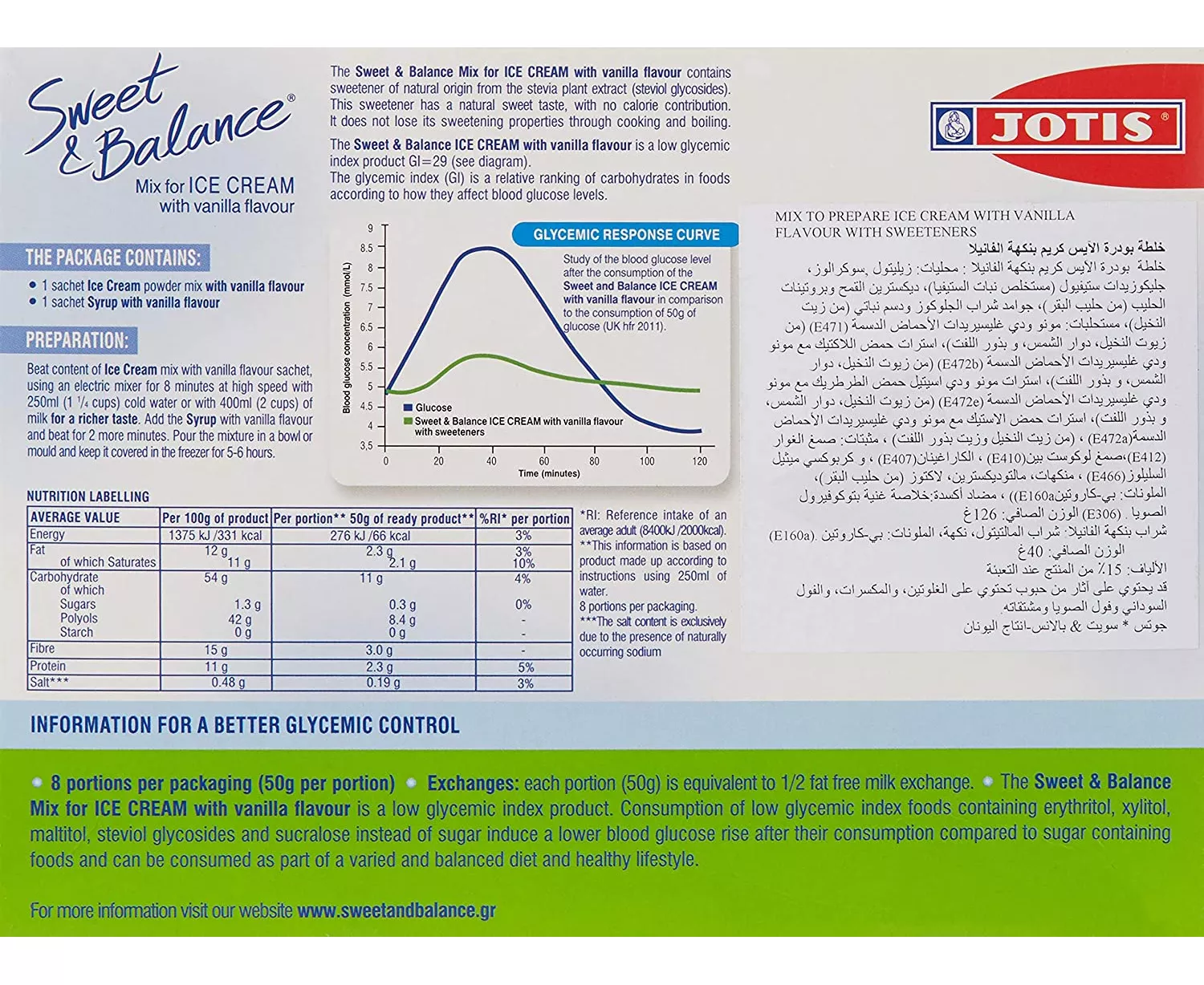 The Sweet and Balance Ice Cream with Chocolate flavor contains sweetener of natural origin from the stevia plant (Ste viol glycosides). This sweetener has a natural sweet taste, with no calorie contribution. It does not lose its sweetening properties through cooking and boiling. Sweet and Balance Ice Cream with Chocolate flavor is a very low glycemic index product. The Glycemic Index (GI) is a relative ranking of Carbohydrates in foods according to how they affect blood glucose levels.