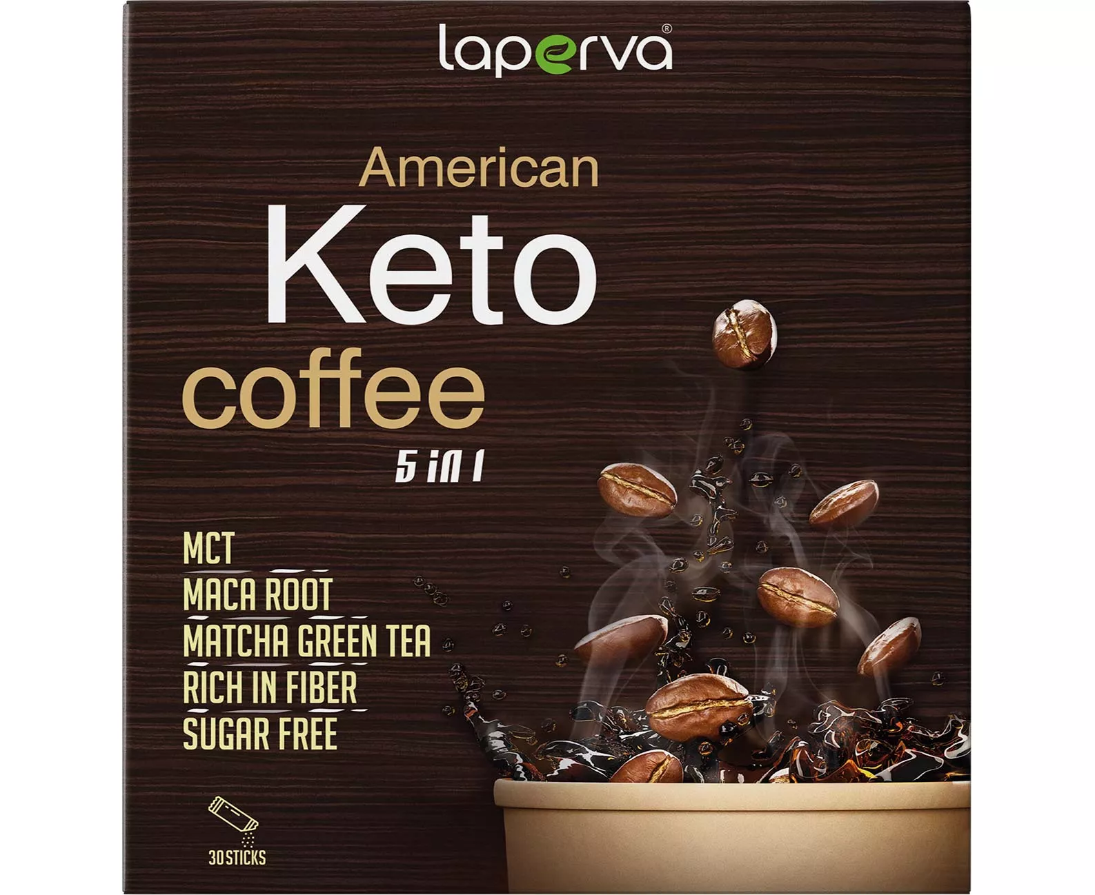 American Keto Coffee 5 in 1 Laperva instant black coffee, extracted from; Maca root and stevia, medium-chain triglycerides, and matcha green tea rich in fiber, vitamins, and antioxidants to reduce weight, provide the body with needed energy, increase focus and attention, and improve libido. It contains C, copper, and iron and contains many biologically active plant compounds in addition to many important and vital functions, increasing sperm production and improving its quality, it also improves menopausal symptoms and interrupted sleep at night and supports mood by reducing depression and anxiety, especially in women of age Despair and contains matcha that helps improve attention, memory and reaction speed, improve brain function and prevent the growth of cancer cells. Coffee contains stevia sugar, which makes it suitable for diabetics and dieters.