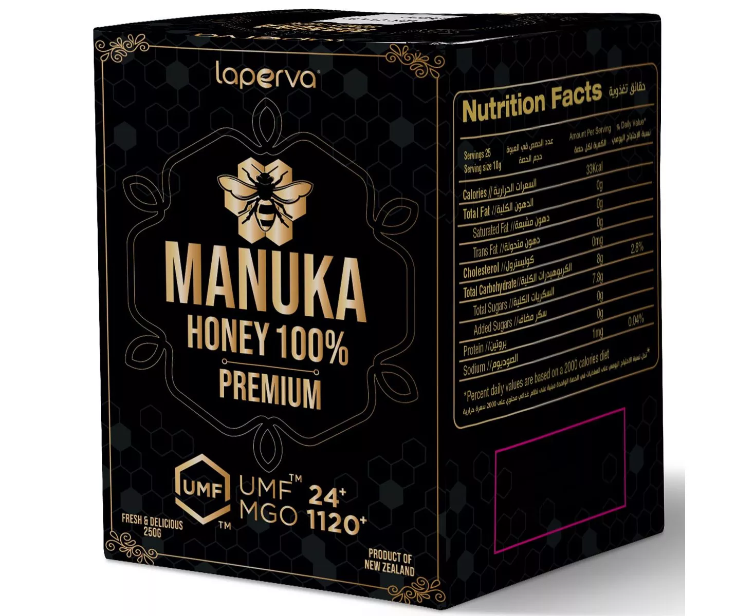 Laperva Manuka New Zealand Honey is the only product in the UAE that contains a high concentration of MGO1120+, which is one of the most powerful antibiotics for the treatment of many diseases, and it also contains a quality certificate from the New Zealand Honey Organization (UMF 24+