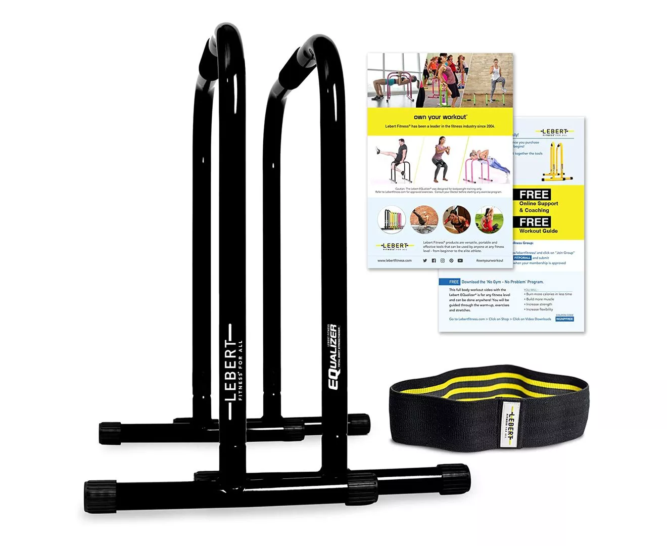 • Two Equalizer bars with heavy duty foam handles, resistance band, exercise guide, and access to an online coaching group. Bars support up to 400lbs, are easy to assemble, stack and store and are great for your home gym or group class bootcamps.