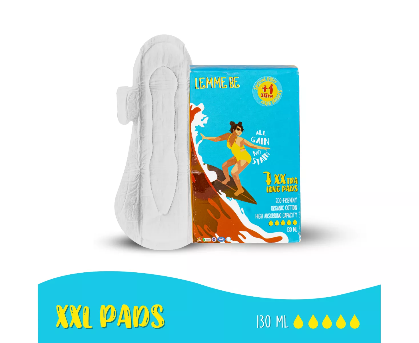 Manage your extra exhausting heavy flow period days with Lemme Be’s Xxtra long Pads! Now with a longer rear, a unique super-absorbent top sheet with a leak lock design, and enhanced capacity, these XXL sanitary pads help you stay dry and fresh all the time.