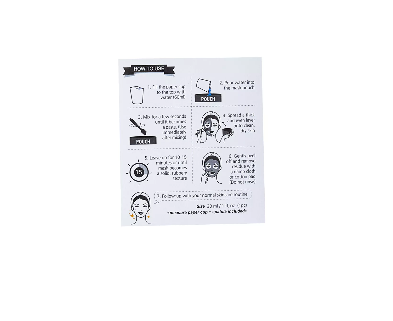 Pour 60 ml water into the mask pouch. Mix for a few seconds until it becomes a smooth paste. Use it immediately after mixing. Spread the paste evenly onto clean, dry skin. Leave on for 10-15 minutes or until the mask becomes solid, rubbery texture. Gently peel off and remove residue with a damp cloth or cotton pad. Do not rinse. Follow up with your normal skincare routine.