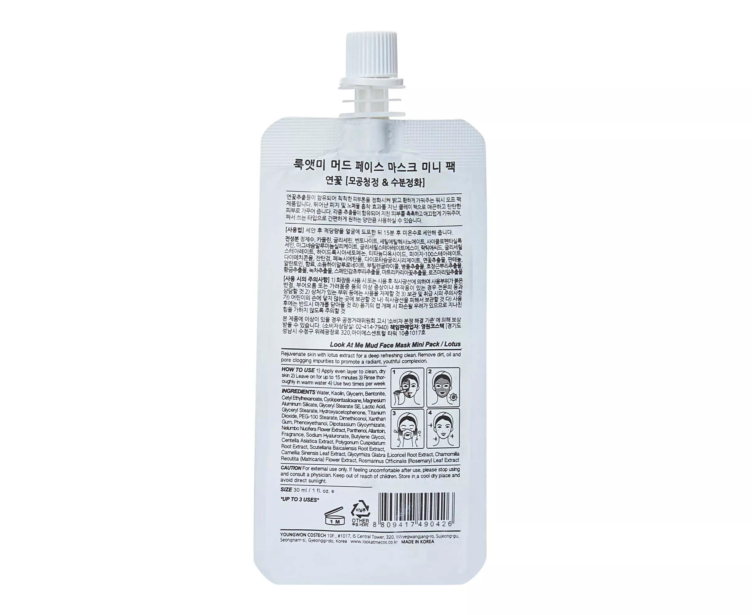 Lotus Mud Face Mask Mini Pack is your first stop for better skin. Feel like you have been at the spa. Rejuvenate skin with lotus extract for a deep refreshing clean. Remove dirt, oil and pore clogging impurities to promote a radiant, youthful complexion. Unlike other mud masks, the Look At Me Mud Face Mask Mini Pack does not crack and dry out your face, keeping skin from feeling dry and tight after washing the mask off. The twist cap allows for cleaner and more sanitary use. Simply squeeze desired amount onto fingers, apply to face, then twist the cap back on to keep remaining mud from being exposed to outside elements such as germs and air. Ingredients are all plant-based and pure; no harmful ingredients such as parabens. Great for travel, easy to use. Give yourself a spa facial anytime. Clean and radiant skin in just 15 minutes!