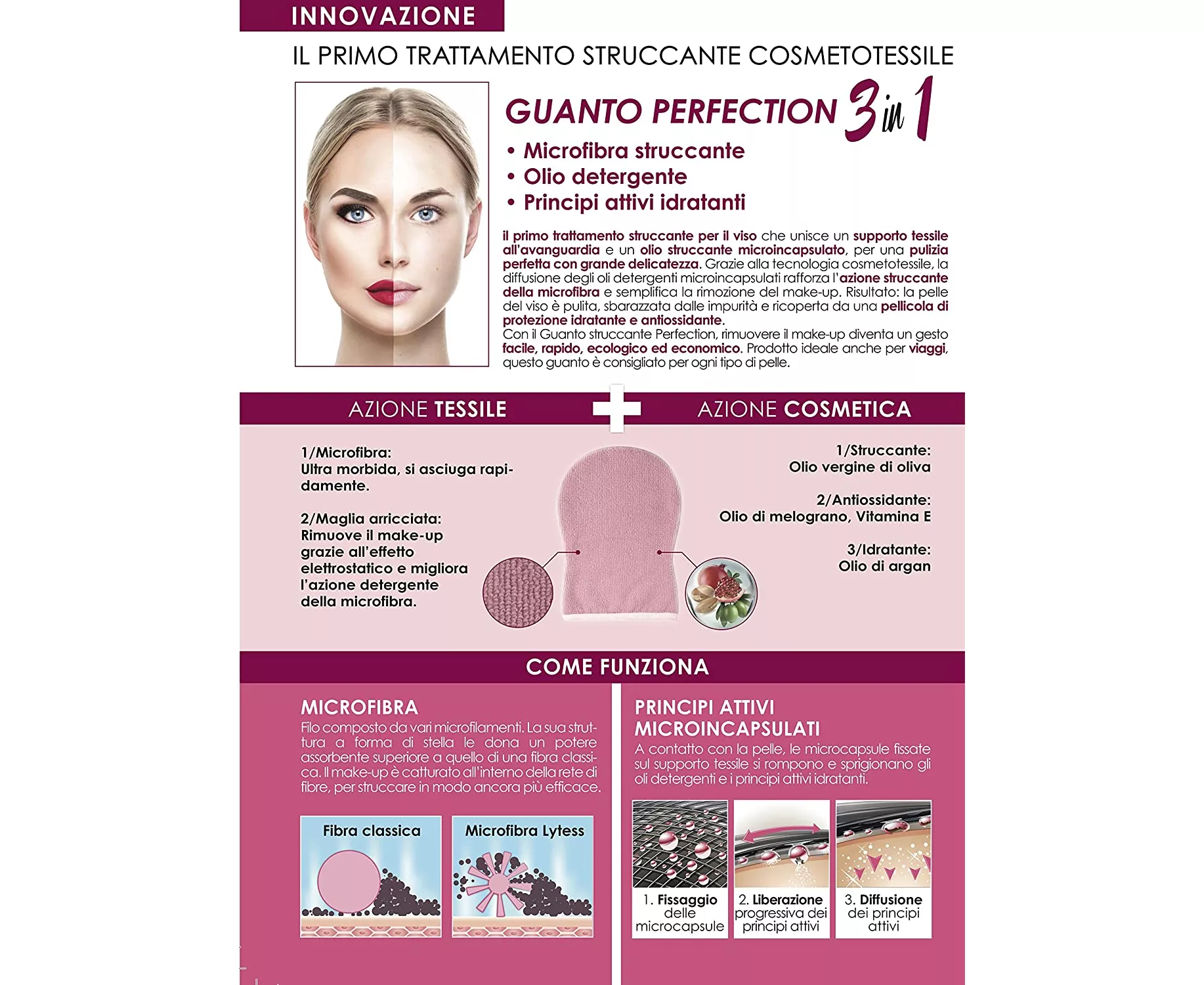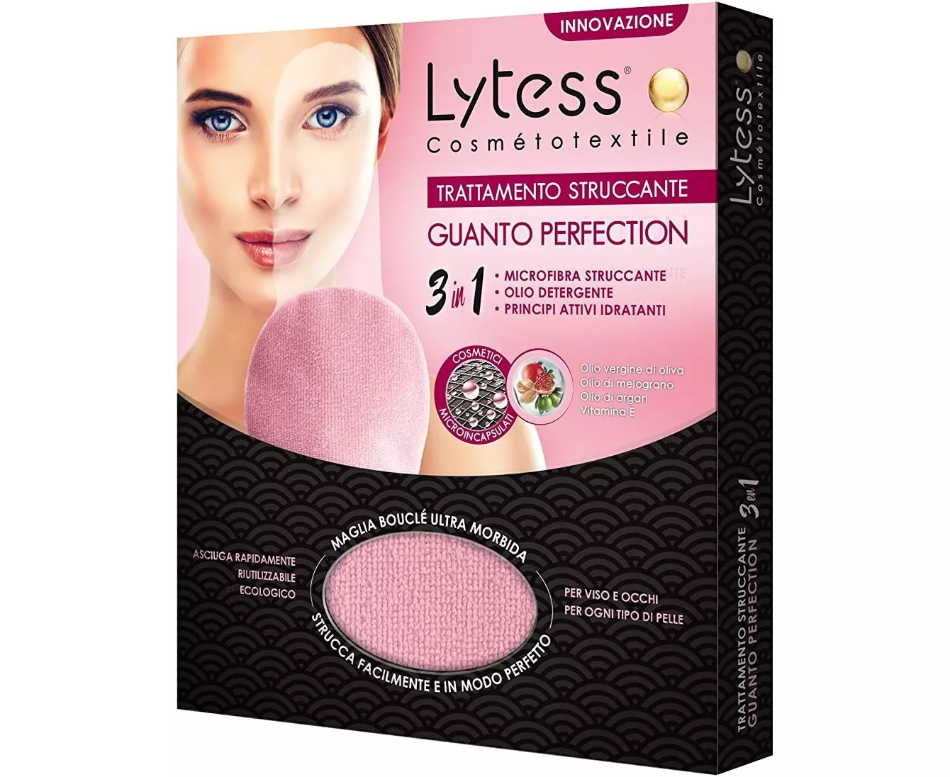 This makeup remover glove replaces disposable makeup remover cotton for more friendly and convenient use. Lytess has developed a 3-in-1 cosmetotextile technology: a microfiber cleansing oils for moisturizing active ingredients. This ultra-soft microfiber glove removes makeup from the face and eye contour in one swipe. Easy to use, it takes care of all skin types. Micro-capsules in the fabric release a nutritious blend of virgin olive oil, pomegranate oil, argan oil and vitamin E upon contact with the skin.