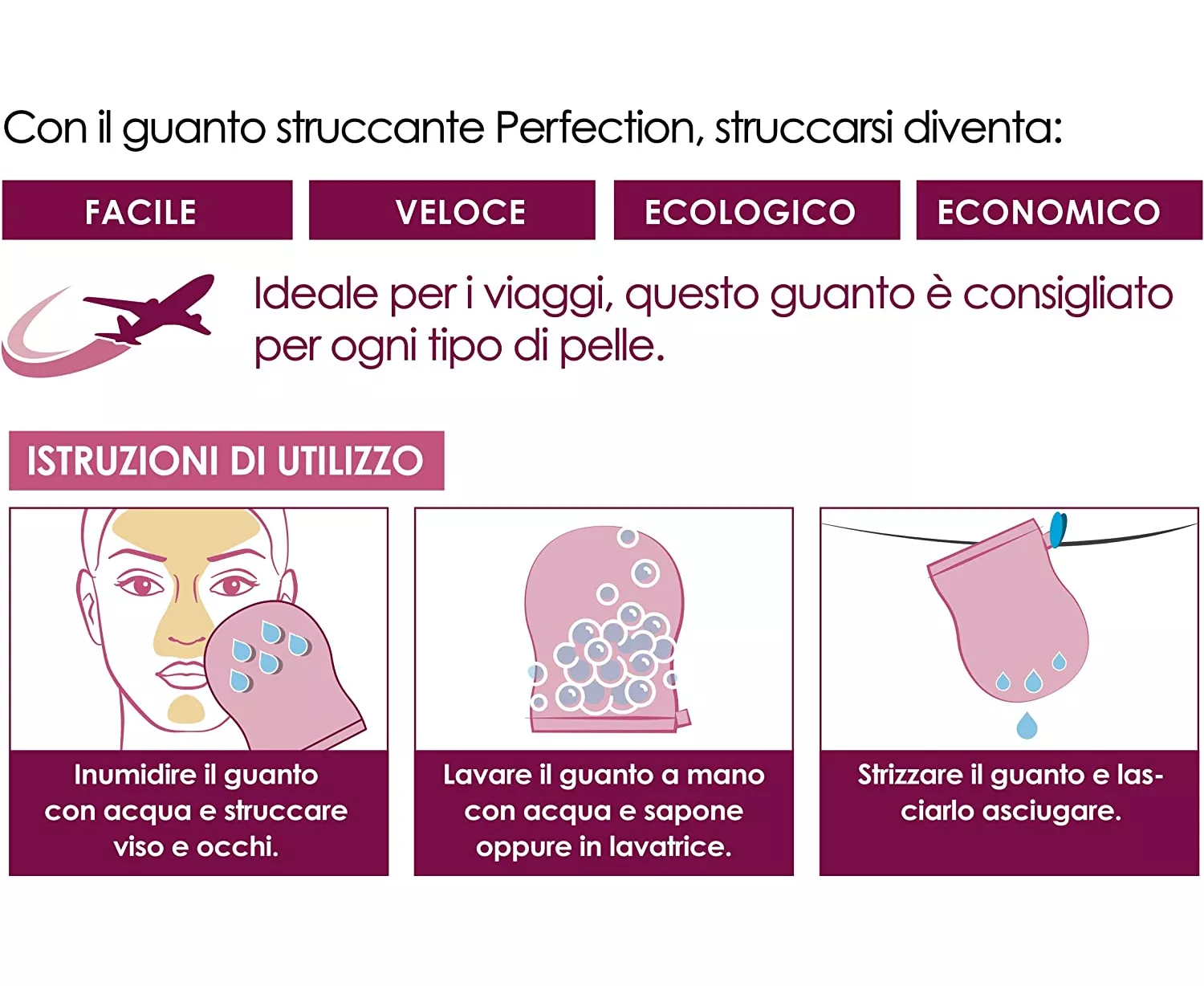 • Moisture the glove with water, remove the make up from face and around the eyes, no need to use any other products.