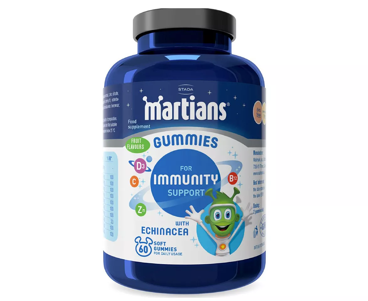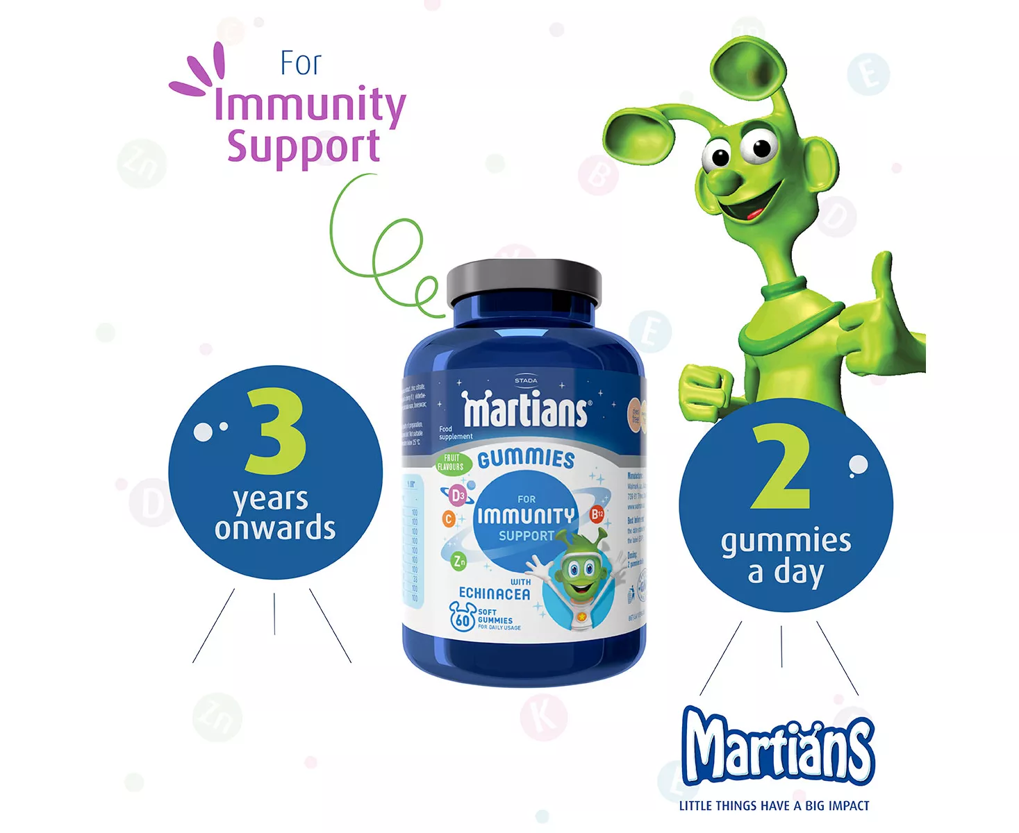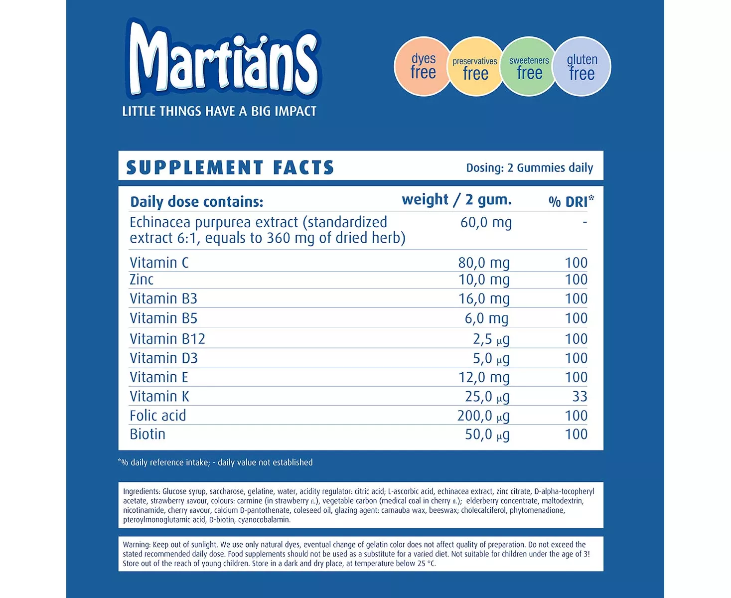 Martians Gummies for Immunity Support is a blend of Vitamins such as C, D3, K and E to support a healthy immune system in children. It contains Echinacea which has been traditionally used to treat and prevent cold and respiratory disease for a long time. The addition of Zinc and Folic Acid provides support for physiological growth, vitality and well-being in children.