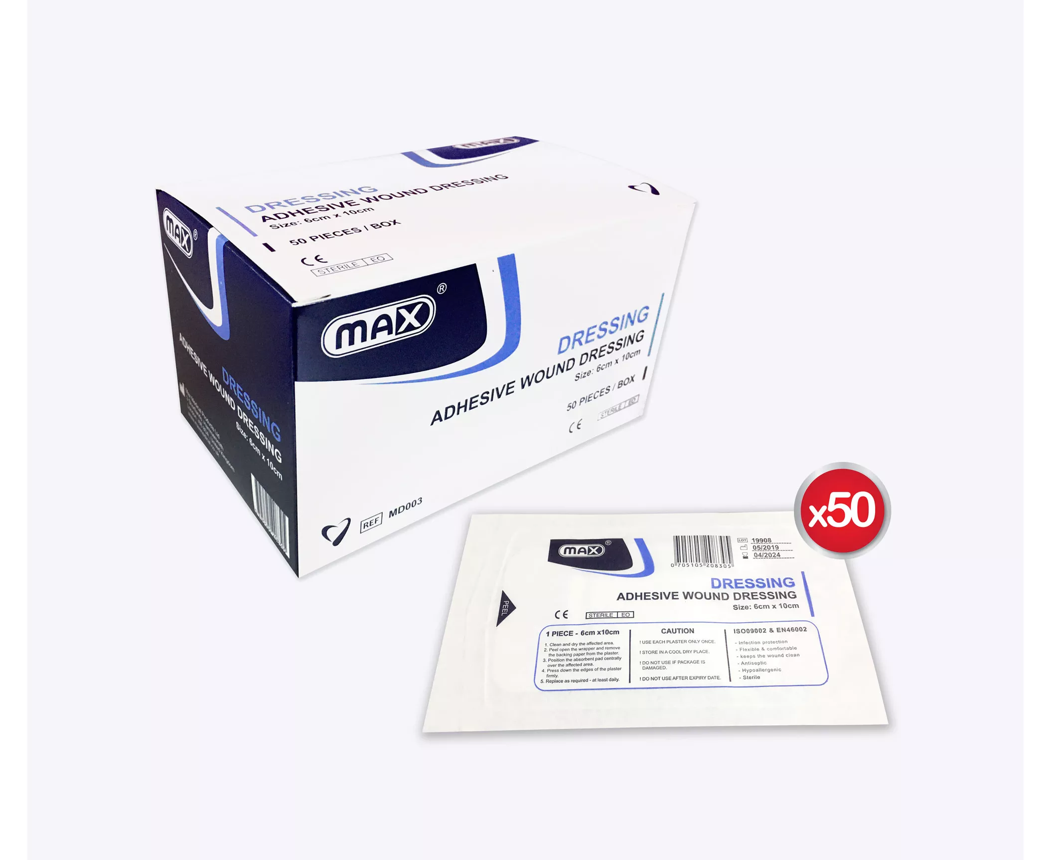 Max Adhesive Wound Dressing helps infection protection. Flexible, comfortable and antiseptic Keeps the wound clean.Sterile Adhesive wound dressing Size: 6cmx10cm 100 pieces per box How to use: Clean and dry the affected area.Peel opens the pouch packing and removes the backing papers from the plaster. Position the absorbent pad centrally over the affected area.Press down the edges of the plasterevenly and firmly on skin.Replace a new wound plaster as required at least daily. Benefits: Protection from infection Hypoallergenic