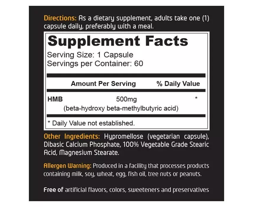 HMB is an active metabolite of leucine that reduces muscle Protein breakdown Benefits: Muscle growth: To build new muscle mass, Protein synthesis or prevent muscle loss Anti catabolic Support recovery Directions Of Use: As a dietary supplement, adults take one capsule daily preferably with a meal.