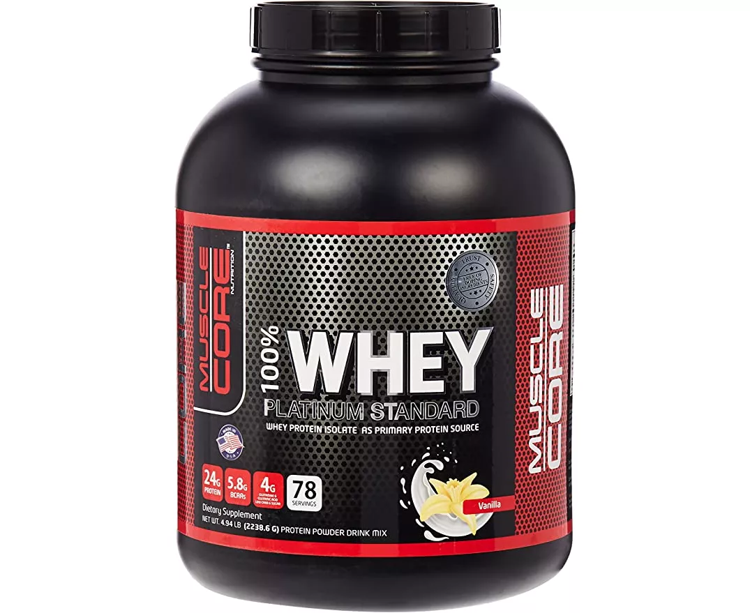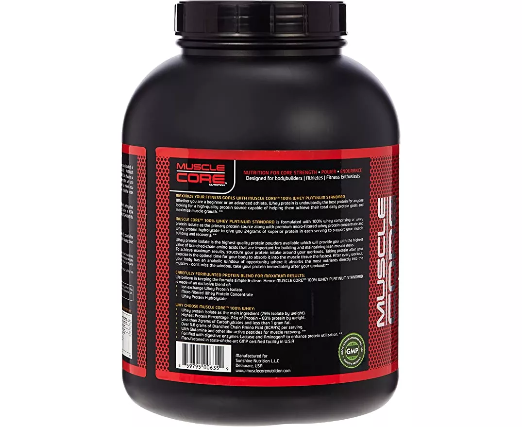 Carefully Formulated protein blend for maximum results. We believe in keeping the formula simple and clean. Hence Muscle Core 100% WHEY PLATINUM STANDARD is made of an exclusive blend of: Ion exchange Whey Protein Isolate. Micro-filtered Whey Protein Concentrate. Whey Protein Hydrolysate. Why choose muscle core 100% WHEY. Whey protein isolate as the main ingredient (79% isolate by weight). good protein percentage: 24 g of protein - 83% protein by weight. Less than 2 grams of carbohydrates and less than 1 gram fat. Over 5. 8 grams of branched-chain amino acid (BCAA's) per serving. With 4 grams Glutamine and other bio-active peptides for muscle recovery. Fortified with digestive enzymes - Lactase and Aminogen to enhance protein utilization. Designed for bodybuilders, athletes and fitness enthusiasts. MAXIMIZE YOUR FITNESS GOALS WITH MUSCLE CORE 100% WHEY PLATINUM STANDARD. Whether you are a beginner or an advanced athlete, whey protein is undoubtedly the best protein for anyone looking for a good-quality protein source capable of helping them achieve their total daily protein goals and maximize muscle growth. MUSCLE CORE 100% WHEY PLATINUM STANDARD is formulated with 100% whey comprising of whey protein isolate as the primary protein source along with premium micro-filtered whey protein concentrate and whey protein hydrolysate to give you 24 grams of superior protein in each serving to support your muscle building and recovery. Whey protein isolate is the good quality protein powders available which will provide you with the good value of branched-chain amino acids that are important for building and maintaining lean muscle mass. To achieve maximum results, structure your protein intake around your workouts. Taking protein after your exercise is the optimal time for your body to absorb it into the muscle tissue the fastest. After every workout, your body has an anabolic window of opportunity where it absorbs the most nutrients directly into the muscles - don't miss the window, take your protein immediately after your workout.