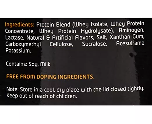 Protein Blend (whey isolate, whey protein concentrate, whey protein hydrolysate) Aminogen, lactase, Naturals and artificial flavors, salt, carboxymethyl cellulose, xanthan gum sucralose, Red beet juice powder (for color) Acesulfame potassium.