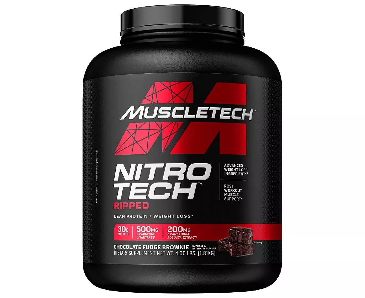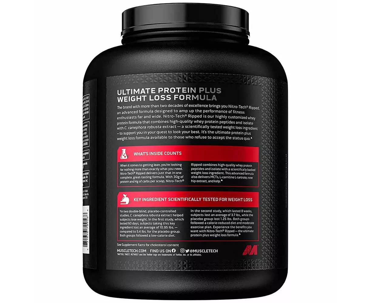 Nitro-Tech Ripped is the latest innovation from MuscleTech, the brand with over 20 years of excellence. This advanced formula combines the highest quality whey protein peptides and isolates with a scientifically tested weight loss ingredient. This 7-in-1 formula also delivers CLA, MCTs, L-carnitine L-tartrate, green tea extract, rosehip extract, and kelp powder. MuscleTech designed this one-of-a-kind formula to deliver ultra-pure protein plus real weight loss results - it's unlike anything you've seen before. And unlike the competition, every scoop of Nitro-Tech Ripped delivers a scientifically studied dose of its key weight loss ingredient, C. canephora robusta, which is backed by two human studies for results you can trust! Plus, it delivers a mouthwatering flavor that your taste buds will love.