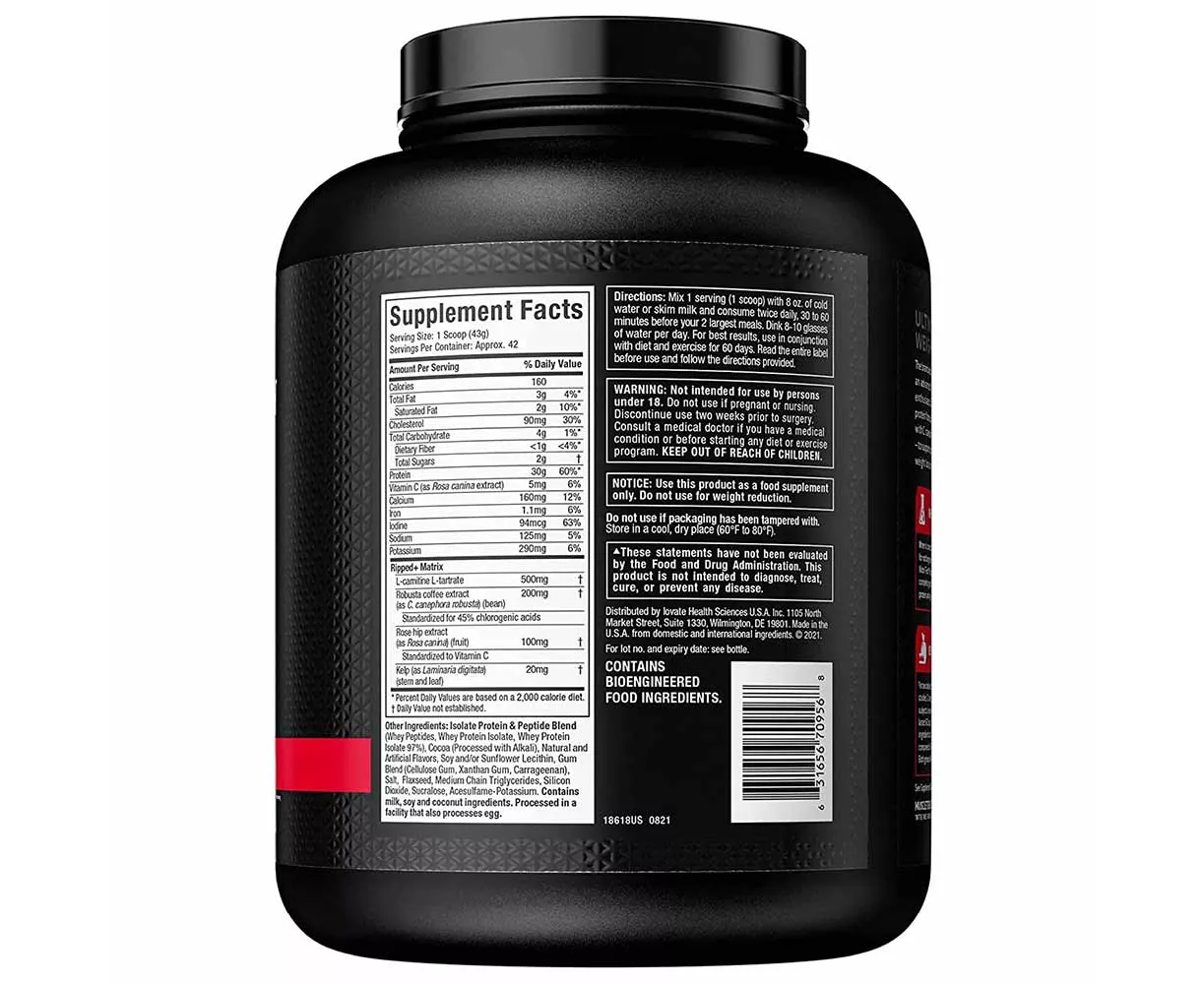 Isolate Protein & Peptide Blend (Whey Peptides, Whey Protein Isolate, Whey Protein Isolate 97%), Cocoa (Processed with Alkali), Natural and Artificial Flavors, Soy, or Sunflower Lecithin, Gum Blend (Cellulose Gum, Xanthan Gum, Carrageenan), Salt, Flaxseed, Medium Chain Triglycerides, Silicon Dioxide, Sucralose, Acesulfame-Potassium.