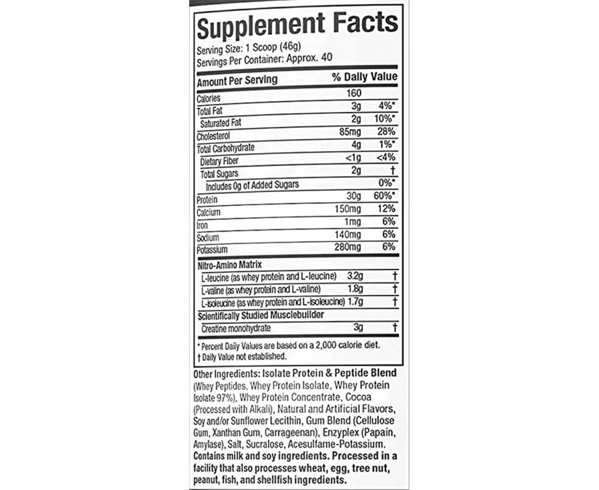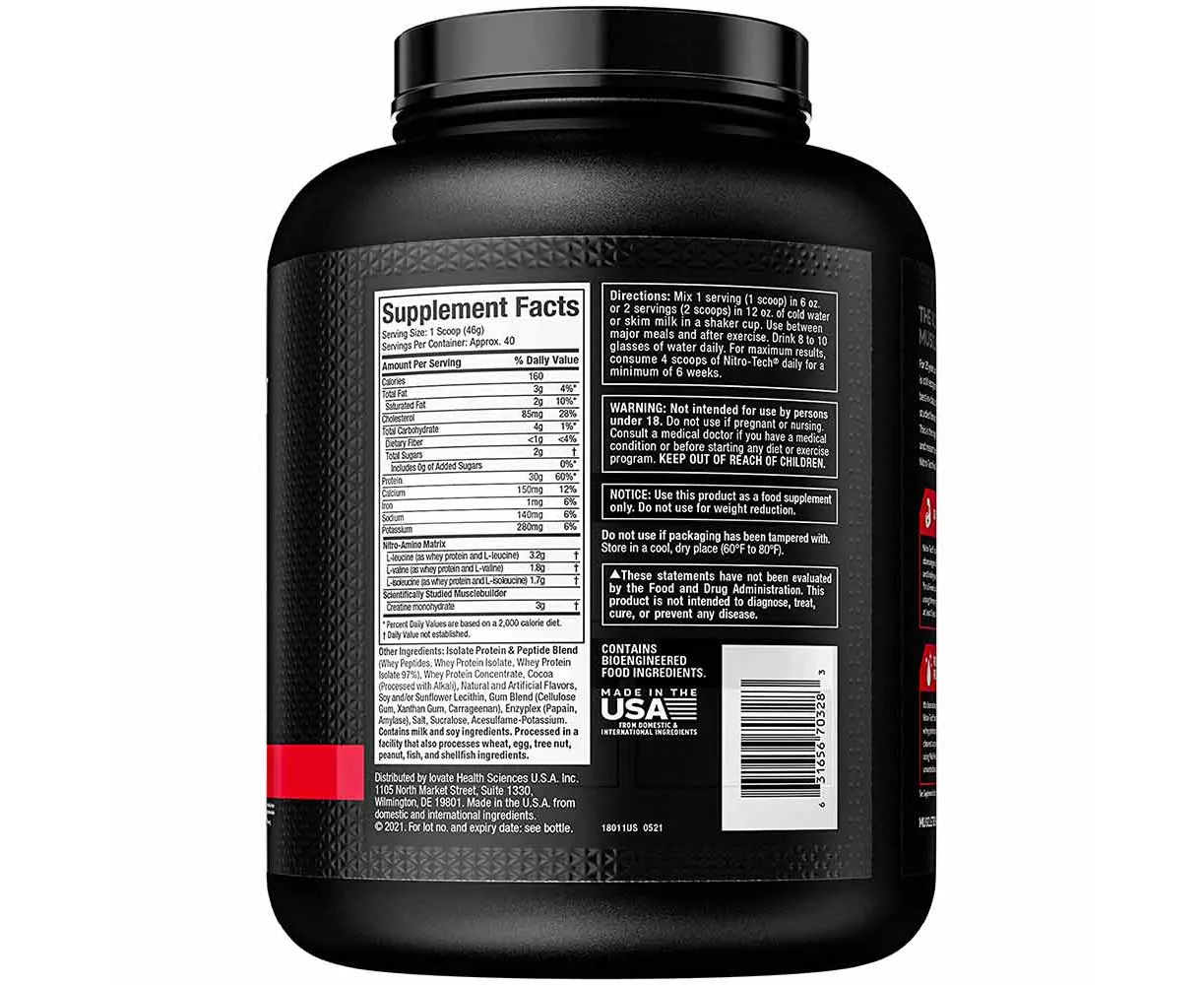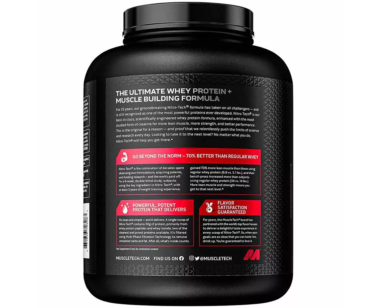 The MuscleTech Nitrotech Performance Series is a premium quality supplement that is great for strong muscle development. It contains 1g of carbohydrate, 1g of sugar and 1.5g of total fat per serving. This supplement is enriched with amino acids and creatine too. Thus, the three major benefits of consuming the MuscleTech Nitrotech Performance Series are: