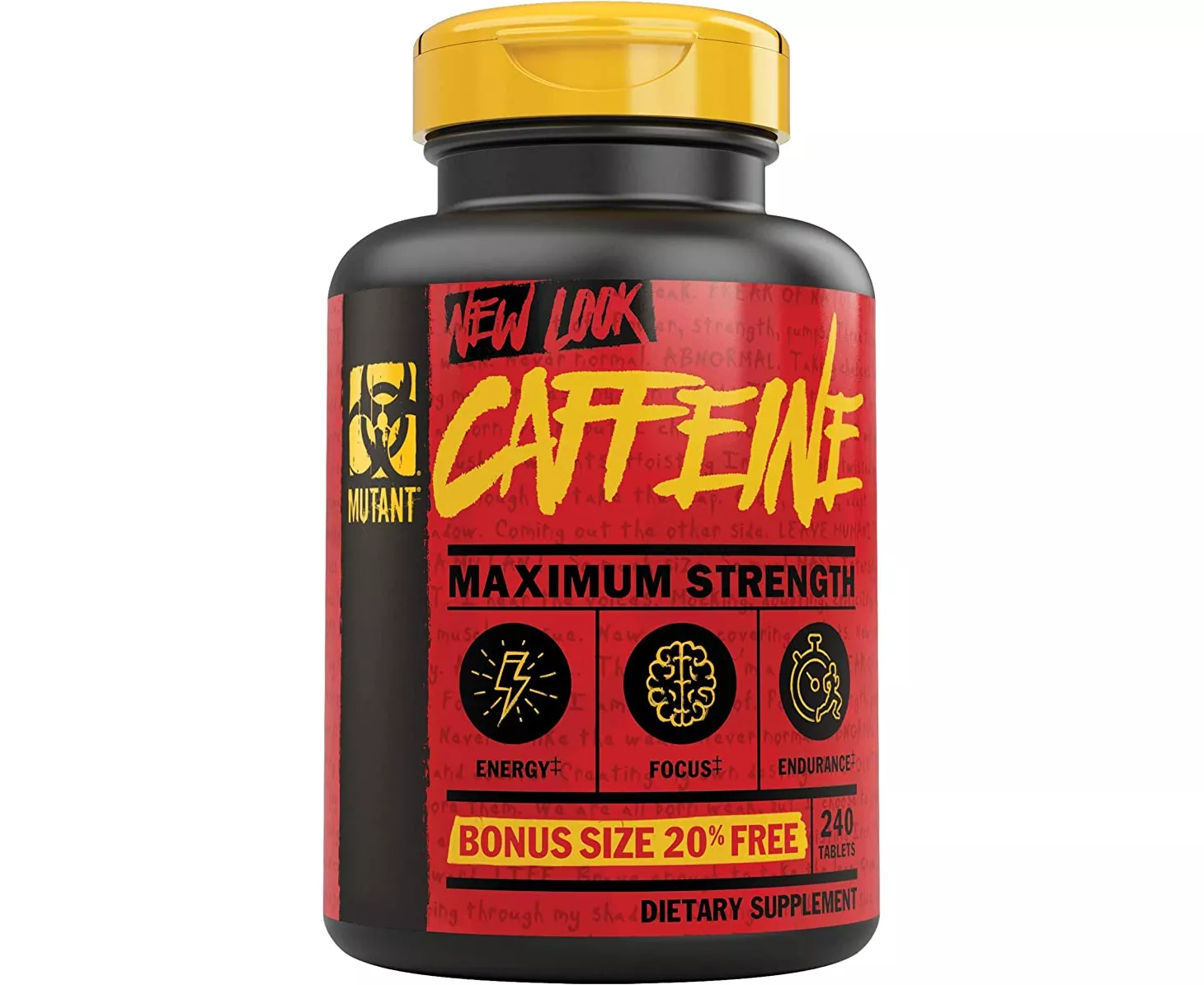 Mutant Caffeine delivers 200 mg of pharmaceutical-grade caffeine anhydrous per serving! Each bottle contains 200 + 40 free servings, all produced in our government-inspected manufacturing facility to ensure maximum potency. Every batch is rigorously tested for quality. Take MUTANT CAFFEINE before cardio to support fat metabolism or any time you need an energy kick to power through your day.Caffeine is the world’s most popular stimulant. It helps energize your workout, crushes hunger, improves mental focus and combats fatigue.
