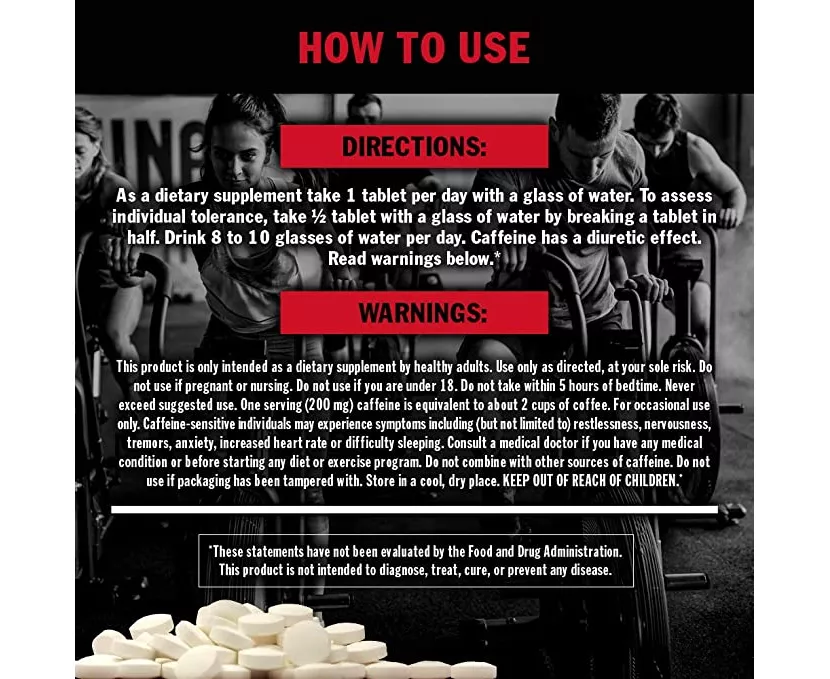 As a dietary supplement take 1 tablet per day. Read warning below. Stay hydrated as caffeine can have a diuretic effect. Caffeine contributes to an increase in endurance capacity & performance and helps improve concentration.
