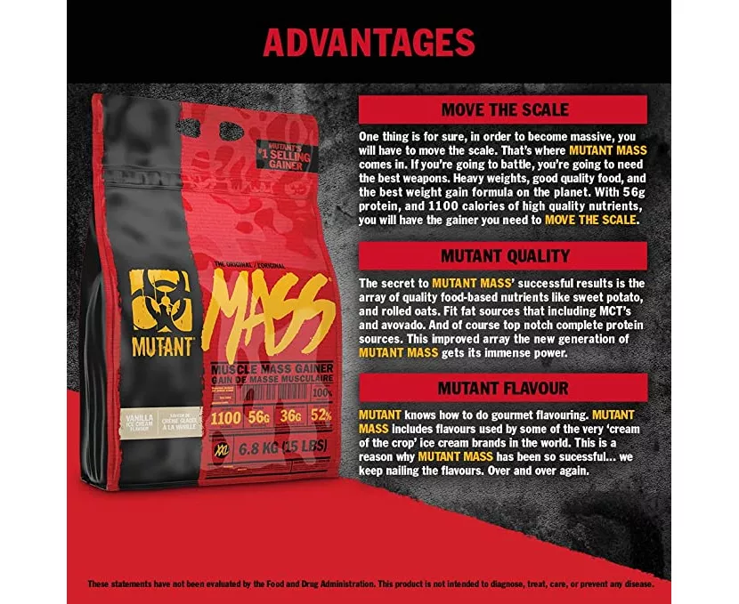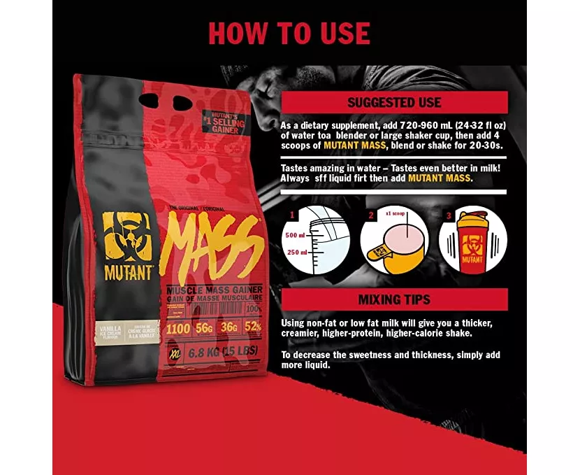 Designed specifically for the strongest bodybuilders and weightlifters that walk the earth, MUTANT MASS has been building muscle in more than 100 countries! This clean gainer is now being discovered by athletes seeking the most powerful gainer commercially available. Each serving feeds your muscles with a massive 1,100 calories, 56 grams of pure protein, 192 grams of clean carbohydrates and 12 grams of fat. Drink one gourmet shake post-workout, in between meals or before bed for maximum results! When added to your diet and training plan, nothing packs on mass like MUTANT MASS.