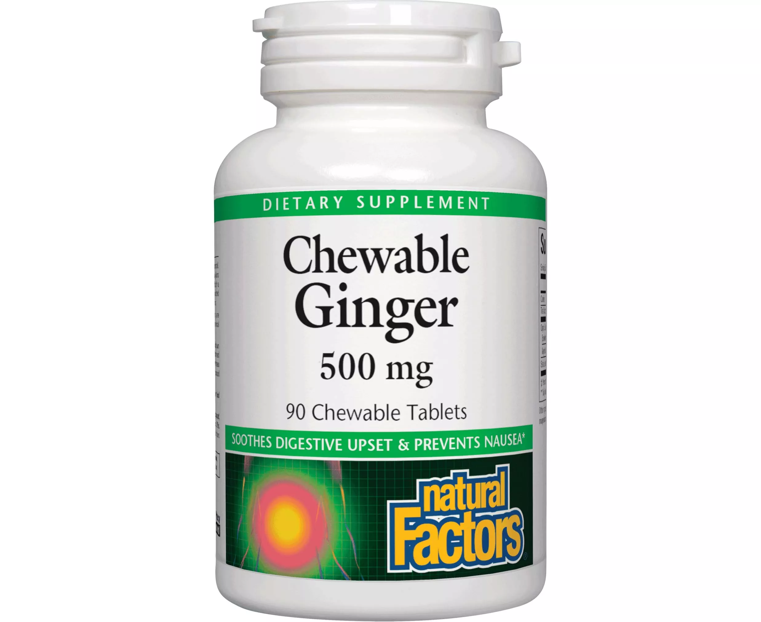Natural Factors Chewable Ginger is standardized to contain 5% gingerol, the bioactive ingredient in ginger responsible for its anti-nausea effect. Each tablet is equivalent to 500 mg of organically grown ginger and is deliciously sweetened with xylitol and stevia.