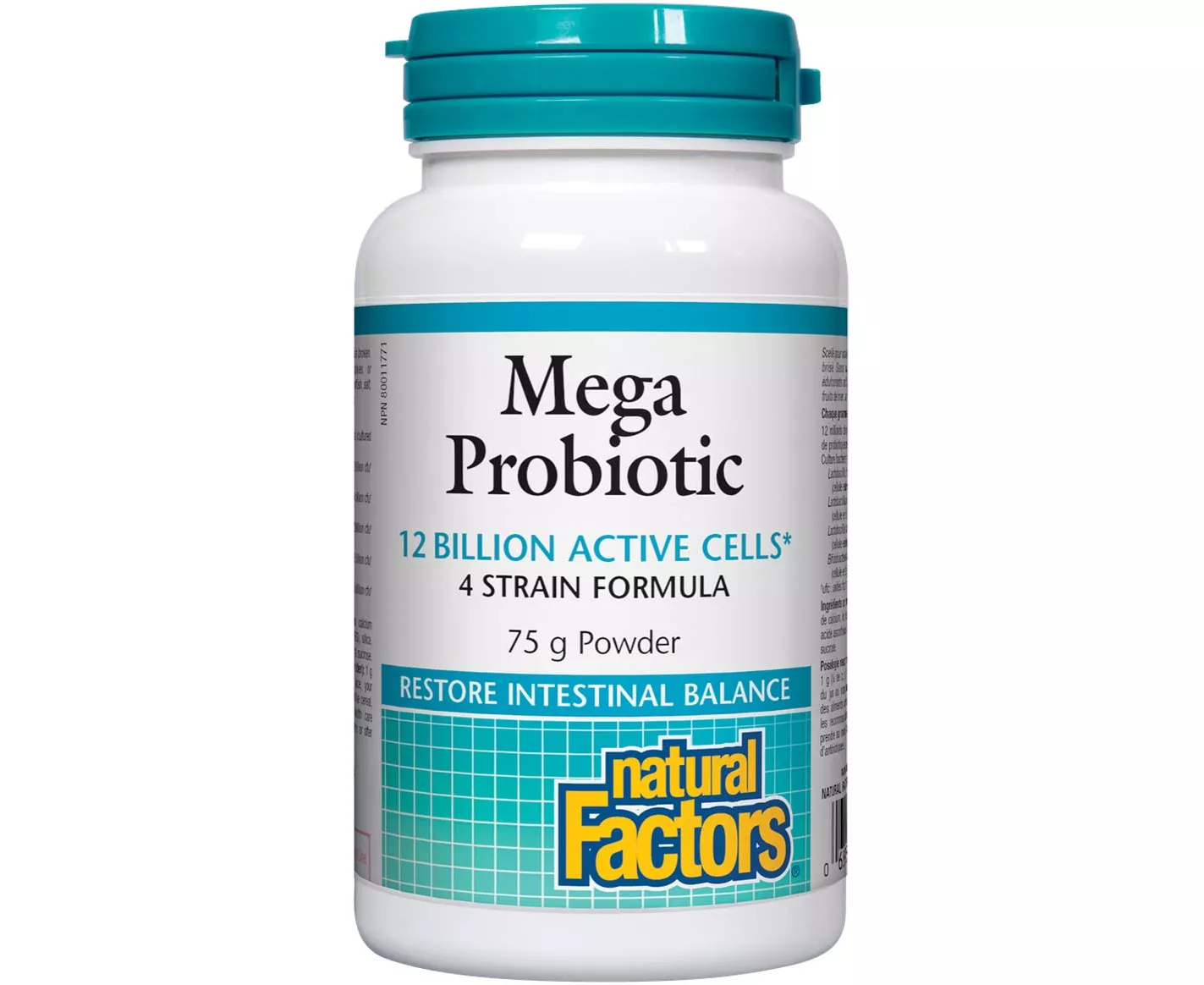 Natural Factors Mega Probiotic Powder contains four strains of probiotics to assist with the maintenance of normal intestinal health. The powder is guaranteed to contain 12 billion active cells per serving along with fructooligosaccharides (FOS) to specifically assist in re-establishing and maintaining normal intestinal microflora.