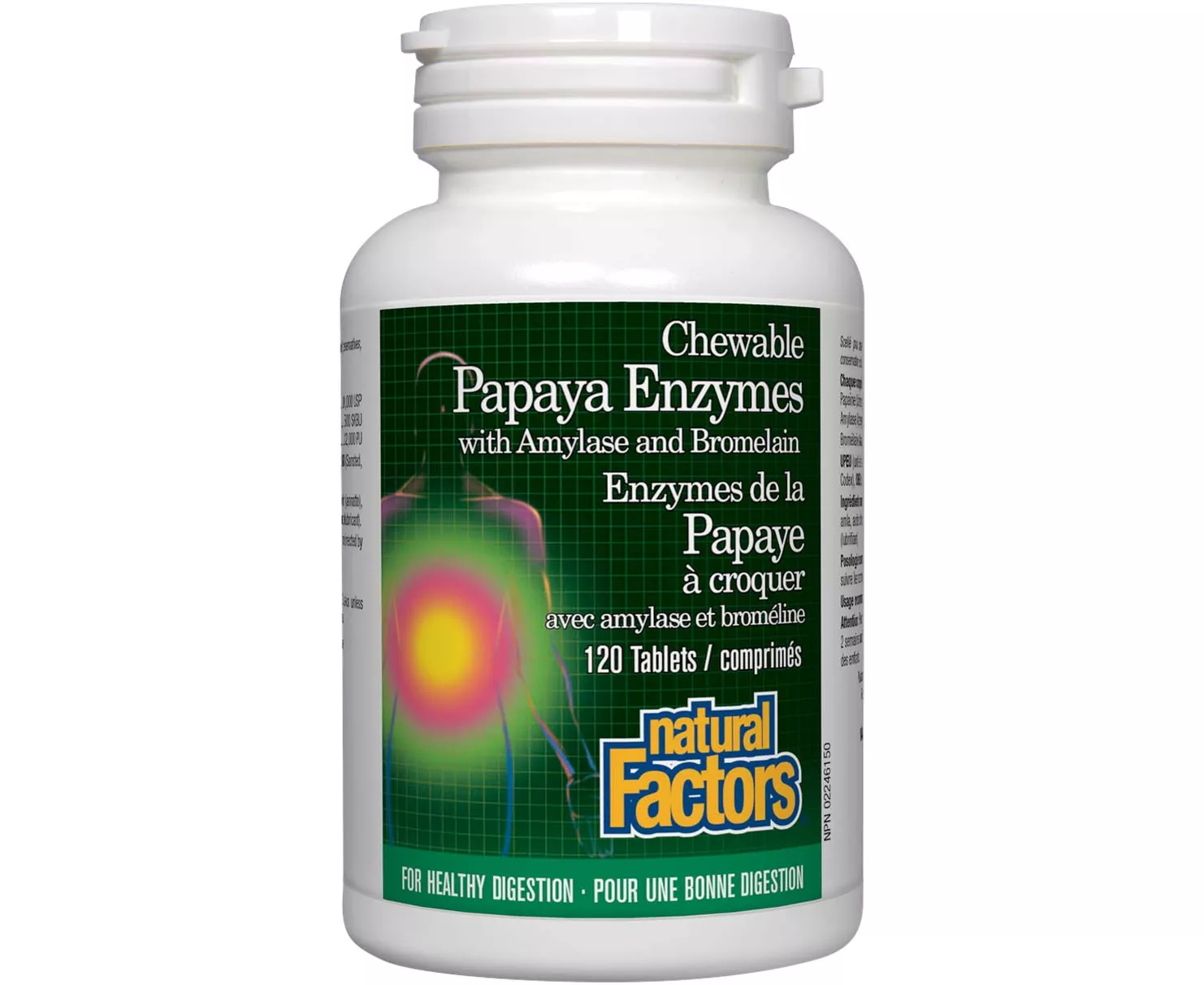 Natural Factors Chewable Papaya Enzymes with Amylase and Bromelain are naturally flavored and help the body in breaking down proteins, fats, and carbohydrates while improving nutrient absorption. Enzymes help to stimulate the good bacteria in the digestive tract, detoxify and cleanse the colon, and improve digestion. Chewable Papaya Enzymes tablets are a delicious source of beneficial enzymes for supporting digestion. Papain and bromelain act to break down proteins into various amino acids. Amylase breaks down carbohydrates. Natural supplementation is an excellent way to replenish enzymes that are lost in foods during cooking and processing.
