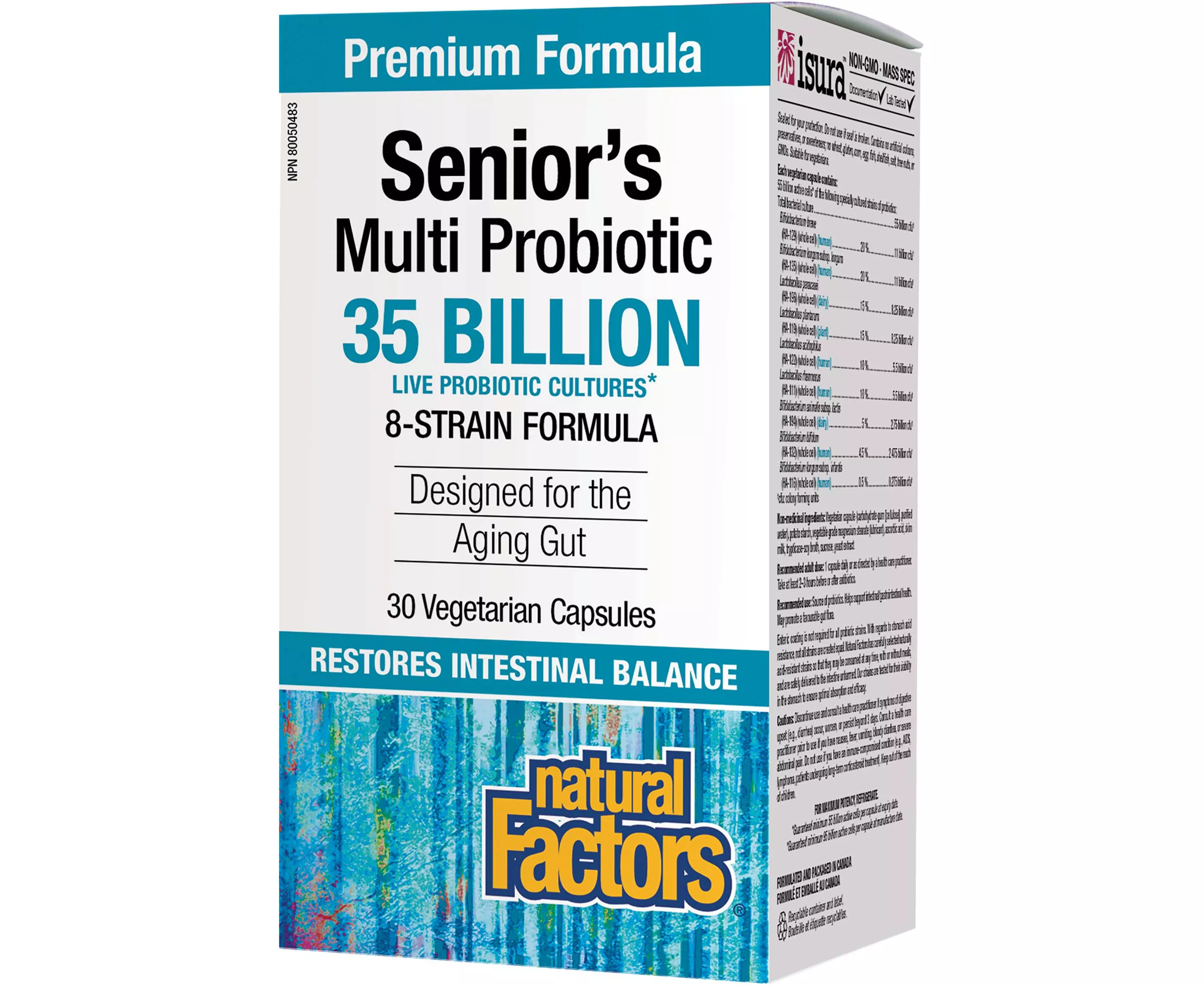 Natural Factors Seniors Multi Probiotic is a dietary supplement designed for those over 65 years of age that is ideal for supporting the digestive process and providing a healthier body in a fast and effective way.The probiotics in Natural Factors Seniors Multi Probiotic bring multiple strains of beneficial live bacteria in the gut to normal levels, helping to facilitate bowel movement and digestion and relieve stomach problems.