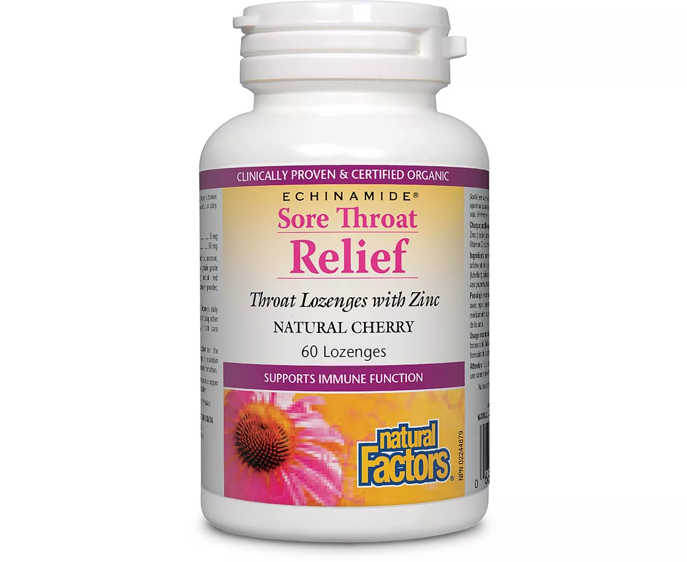 Natural Factors Sore Throat Relief are a group of vitamins that help maintain and strengthen immune function to relieve or prevent colds and sore throats, so they contain vitamin C and zinc