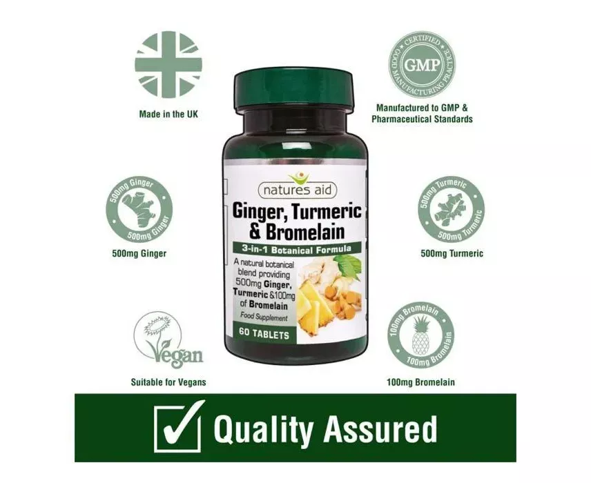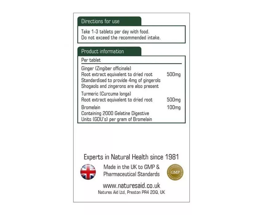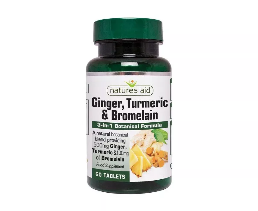 Natures Aid Ginger, Turmeric & Bromelain is a natural botanical blend providing 500mg Ginger, Turmeric and 100mg of Bromelain.