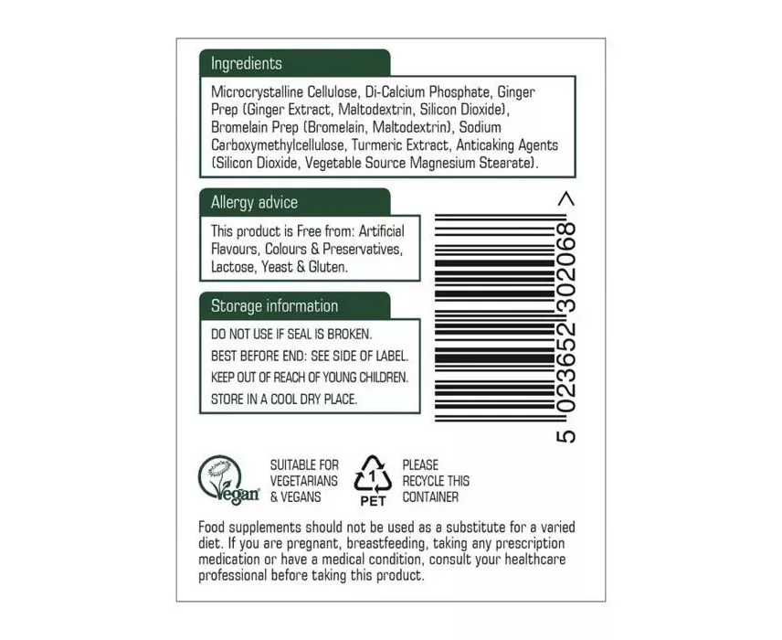Microcrystalline Cellulose, Di-Calcium Phosphate, Ginger Prep. (Ginger Extract, Maltodextrin, Silicon Dioxide), Bromelain Prep, (Bromelain Maltodextrin), Sodium Carboxymethylcellulose, Turmeric Extract, Anticaking Agents (Silicon Dioxide, Vegetable Source Magnesium Stearate).