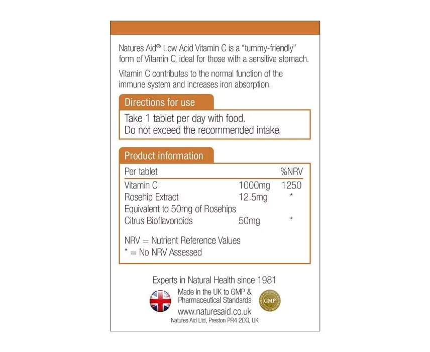 There are many different forms of Vitamin C, with the most common form found in supplements being Ascorbic Acid. Some people find this form of Vitamin C too acidic, especially those with sensitive stomachs. At Natures Aid, our Low Acid Vitamin C 1000mg tablets have been carefully formulated by our expert nutritionists. This low acid formulation combines Ascorbic Acid with more gentle forms of Vitamin C, such as Calcium Ascorbate, and Sodium Ascorbate, resulting in a product that is gentle on the tummy while still providing 1000mg of Vitamin C per tablet.