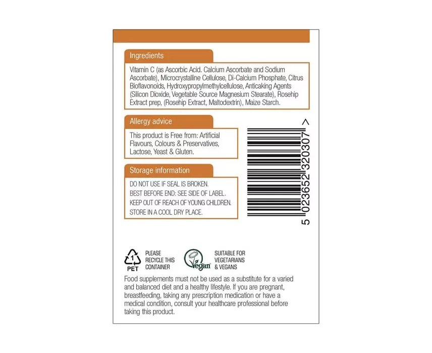 Vitamin C (as Ascorbic Acid Prep. [Ascorbic Acid, Hydroxypropylmethylcellulose], Calcium Ascorbate Prep. [Calcium Ascorbate, Hydroxypropylmethylcellulose] and Sodium Ascorbate), Microcrystalline Cellulose, Di-Calcium Phosphate, Citrus Bioflavonoids, Anticaking Agents (Silicon Dioxide, Vegetable Source Magnesium Stearate), Rosehip Extract Prep. (Rosehip Extract, Maltodextrin).