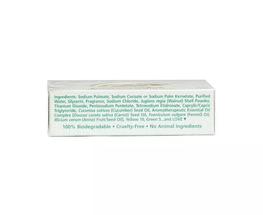 Sodium palmate, sodium cocoate or sodium palm kernelate, purified water, glycerin, fragrance, sodium chloride, juglans regia (walnut) shell powder, titanium dioxide, pentasodium pentetate, tetrasodium etidronate, caprylic/capric triglyceride, cucumus sativus (cucumber) seed oil, aromatherapeutic essential oil complex [daucus carota sativa (carrot) seed oil, foeniculum vulgare (fennel) oil, illicium verum (anise) fruit/seed oil], yellow 10, green 5.