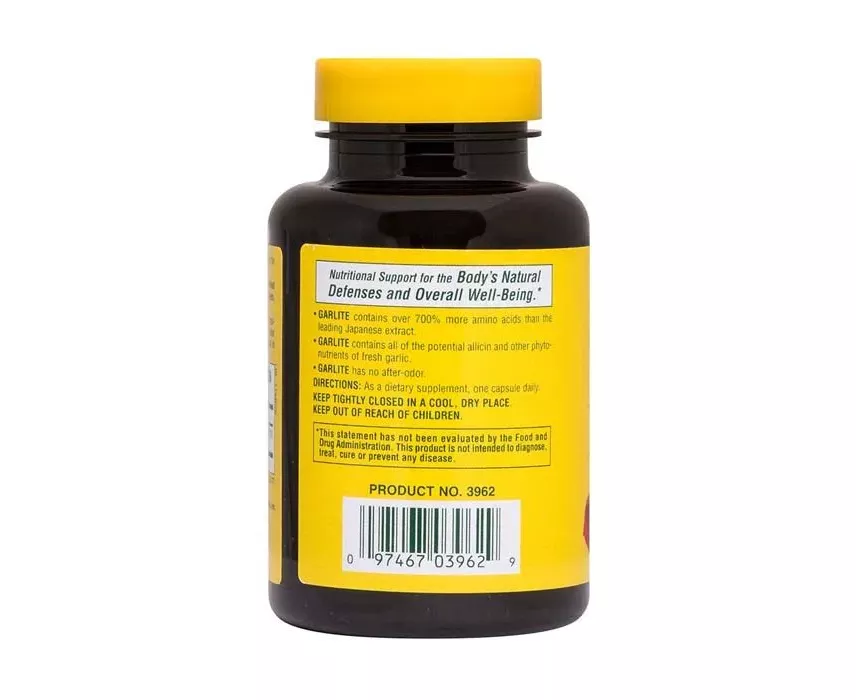 An advanced odorless garlic formulation, manufactured with the unique non-GMO aged garlic. Garlite contains all the natural allicin, vitamins, minerals and amino acids present in fresh garlic. Garlite vegetarian capsules guarantee no after-odor, through either the mouth or pores, after consumption. NaturesPlus is committed to offering the best supplements available anywhere. Look for the NaturesPlus logo as your guarantee of quality.Directions: As a dietary supplement, one capsule daily.Manufacturer/Importer/Packed By :NATURES PLUS Key Features: Odorless garlic Hypoallergenic Vegetarian Gluten-free