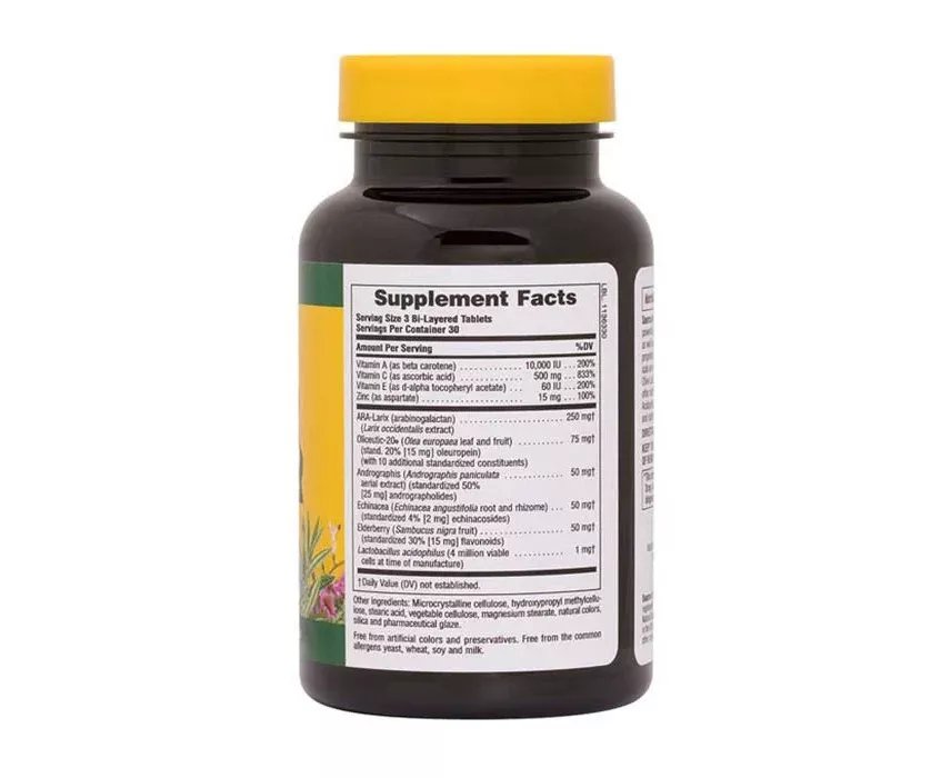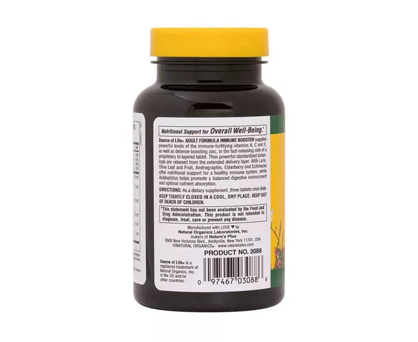 Source of Life Adult Formula Immune Booster supplies powerful levels of the immune-fortifying vitamins A, C, and E, as well as defense-boosting zinc, in the fast-releasing side of a proprietary bi-layered tablet. Then powerful standardized botanicals are released from the extended delivery layer. ARA-Larix, Olive Leaf and Fruit, Andrographis, Elderberry, and Echinacea offer nutritional support for a healthy immune system, while Acidophilus helps promote a balanced digestive environment and optimal nutrient absorption.