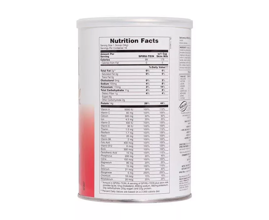 • Add one heaping scoop (scoop included in can) of Strawberry Spiru-Tein Powder to 8 fl. oz. of skim milk, whole milk, or juice, and mix (or shake) until smooth. For best results, milk or juice should be very cold.