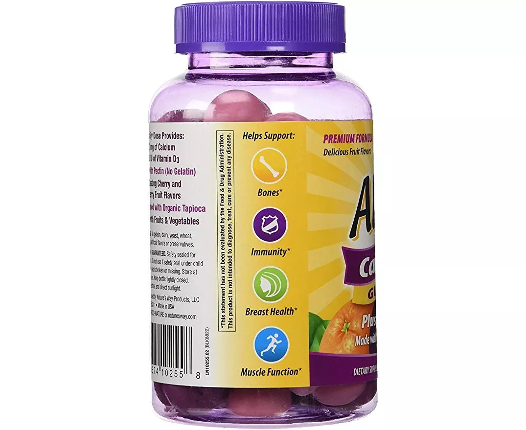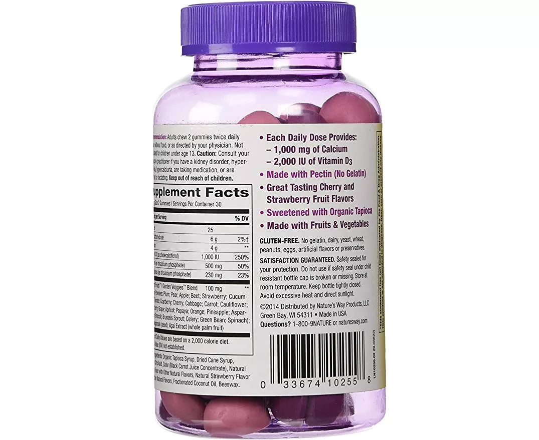Nature's Way Alive Calcium+D3 Gummies is a premium Formula that is formulated to help support bone, immunity, breast health and muscle function. Each dose of Nature's Way Alive Calcium+D3 Gummies provides 1,000mg of Calcium and 2,000IU of Vitamin D3. In addition, these gummies are equipped with great tasting cherry and strawberry fruit flavors. Furthermore, the gummies are made with Pectin which means no Gelatin is added.