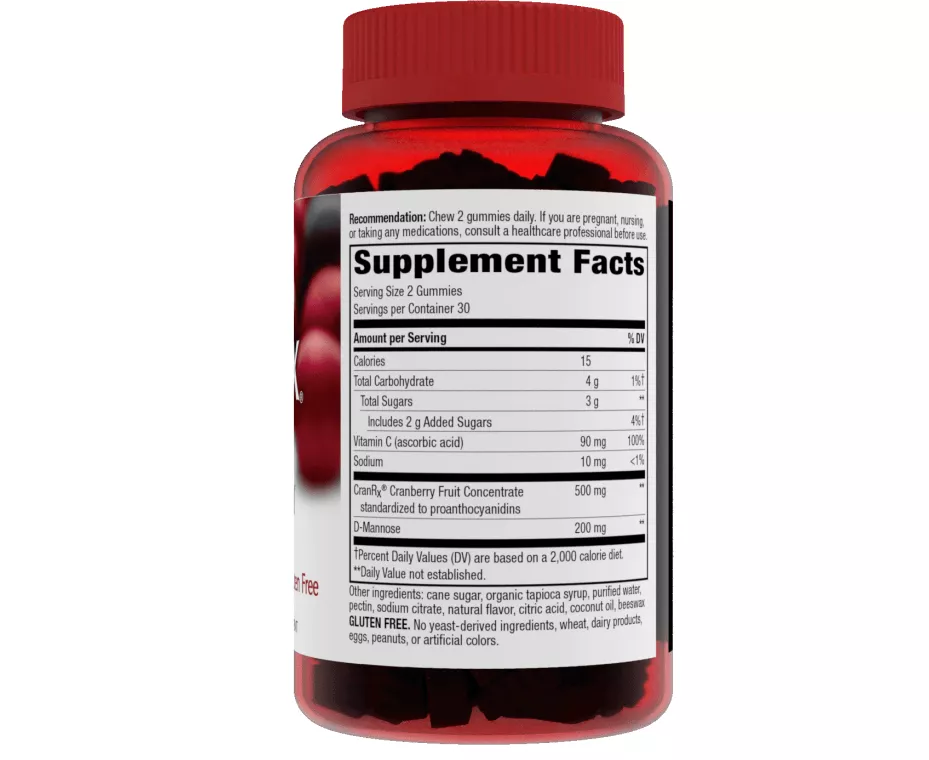 CranRx Gummies are made with 500 mg of whole cranberry concentrate standardized to PACs (proanthocyanidins, the flavonoids found in cranberry fruit), with D-Mannose and vitamin C to support urinary health. CranRx gummies are pectin-based and sweetened with tapioca and cane sugar.