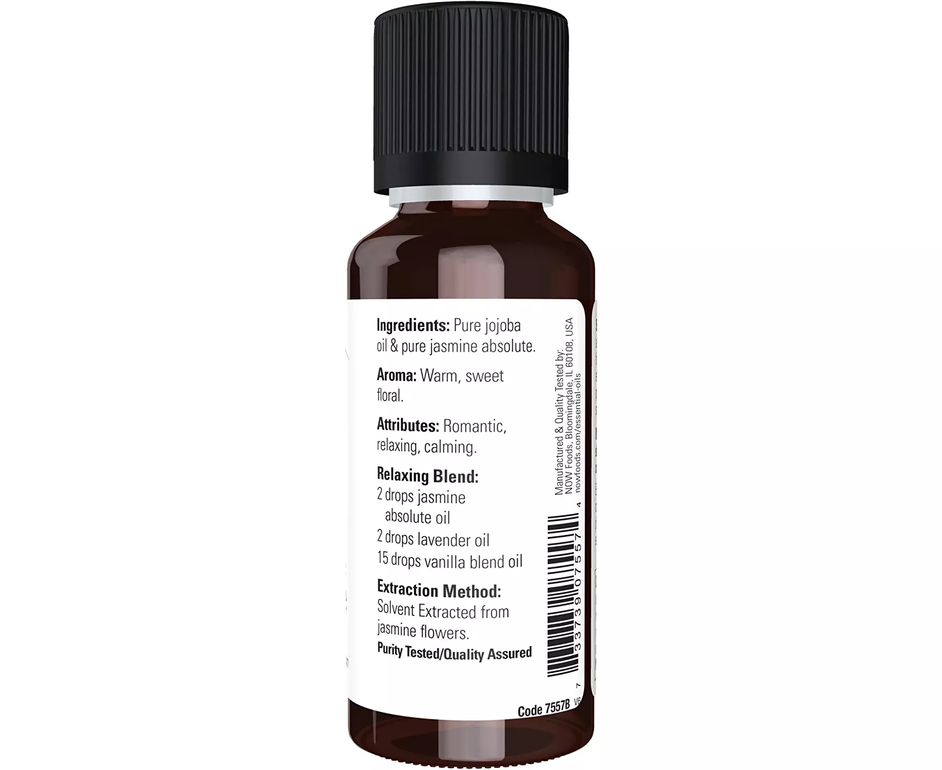 2 drops jasmine absolute oil. 2 drops lavender oil. 15 drops vanilla blend oil. This blend is already pre-diluted and ready for use. Please consult an essential oil book or other professional source for suggested uses.