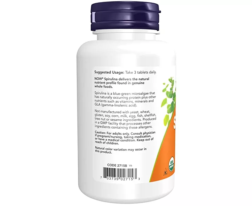 Spirulina is a blue-green microalgae that has naturally occurring protein, plus other nutrients such as vitamins, minerals and GLA (gamma-linolenic acid). NOW® Certified Organic Spirulina Tablets are pure and contain no excipients, binders, or additives.