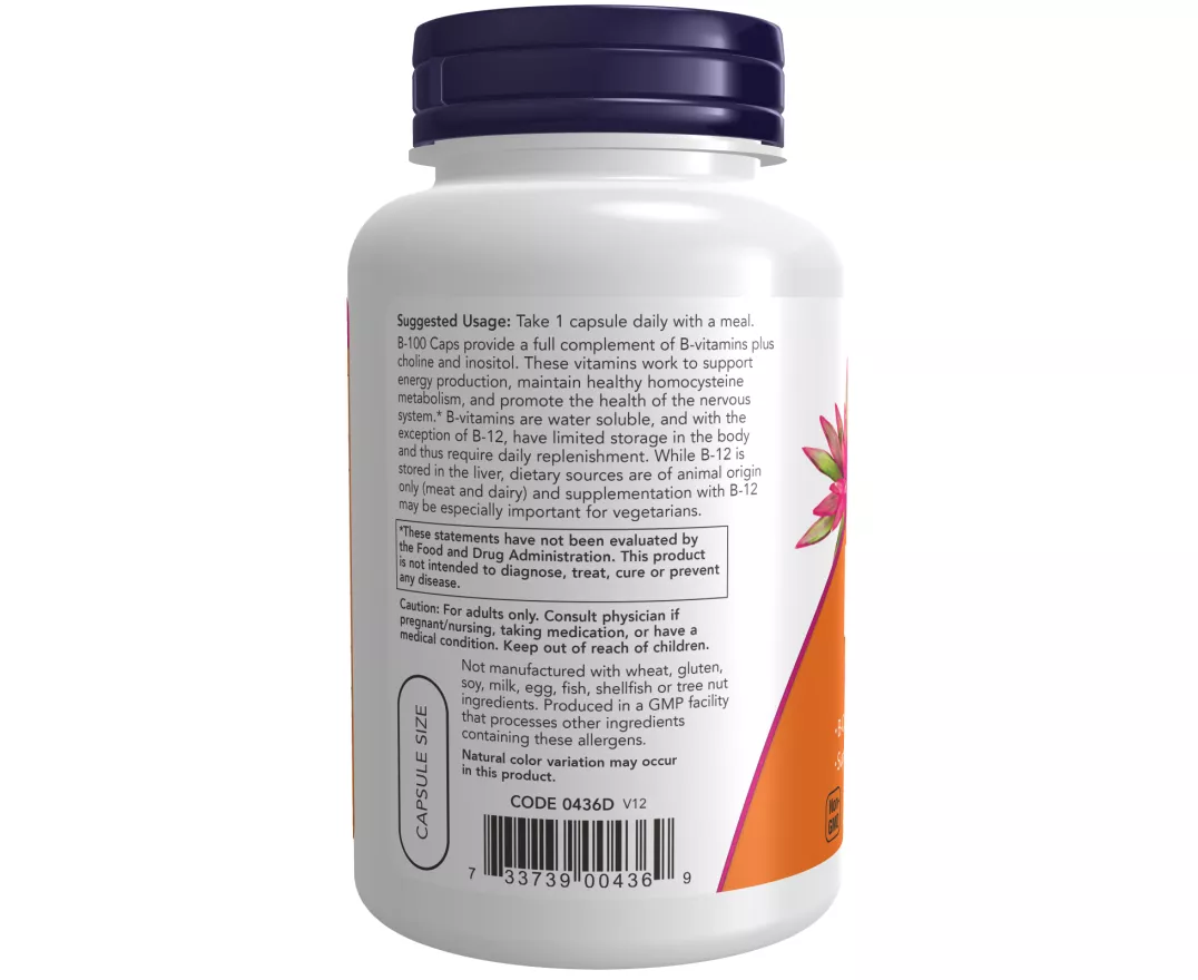 B-100 Caps provide a full complement of B-vitamins plus choline and inositol. These vitamins work to support energy production, maintain healthy homocysteine metabolism, and promote the health of the nervous system. B-vitamins are water soluble, and with the exception of B-12, have limited storage in the body and thus require daily replenishment. While B-12 is stored in the liver, dietary sources are of animal origin only (meat and dairy) and supplementation with B-12 may be especially important for vegetarians. Natural color variation may occur in this product.
