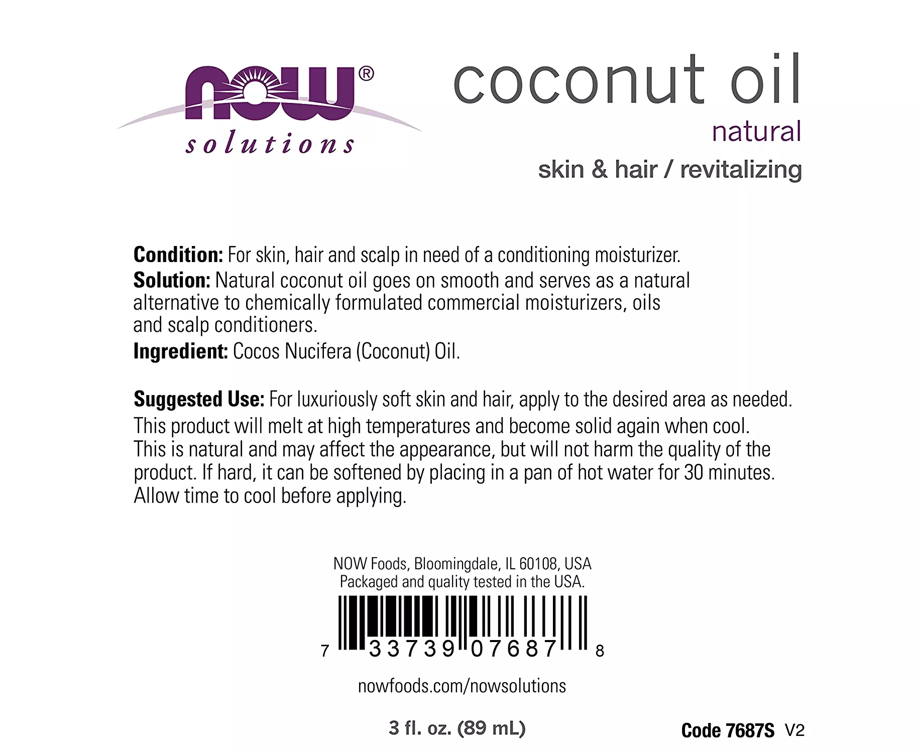 Coconut oil is rich in skin-friendly saturated fats, making it perfect for use on all complexions. This unique oil goes on smooth to leave skin feeling silky and refreshed. It also serves as a great alternative to chemically formulated commercial moisturizers, oils, and scalp conditioners. NOW® Coconut Oil is made by mechanical extraction of the coconut fruit and then deodorized. Ingredient: Cocos Nucifera (Coconut) Oil.