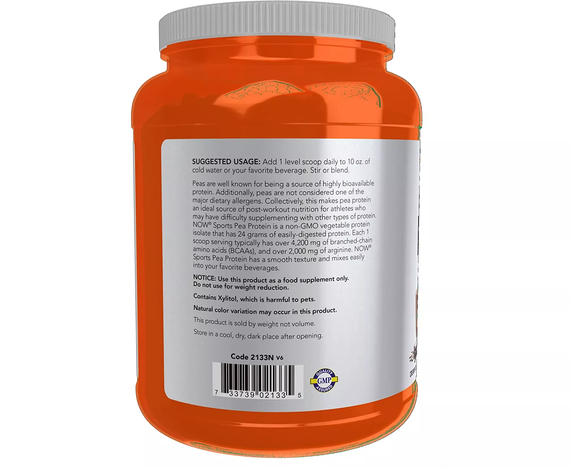 Peas are well known for being a source of highly bioavailable protein. Additionally, peas are not considered one of the major dietary allergens. Collectively, this makes pea protein an ideal source of post-workout nutrition for athletes who may have difficulty supplementing with other types of protein. NOW® Sports Pea Protein is a non-GMO vegetable protein isolate that has 24 grams of easily-digested protein. Each 1 scoop serving typically has over 4,200 mg of branched-chain amino acids (BCAAs), and over 2,000 mg of arginine. NOW® Sports Pea Protein has a smooth texture and mixes easily into your favorite beverages.