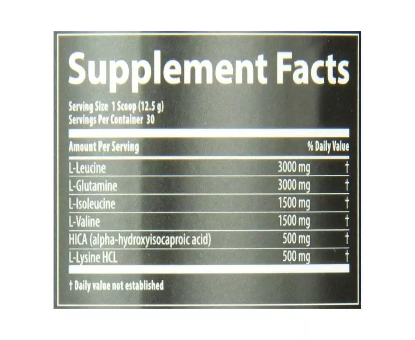 L-Leucine, L-Glutamine, L-Isoleucine, L-Valine, HICA (alpha-hydroxyisocaproic acid), L-Lysine HCL, Natural and Artificial Flavors, Citric Acid, Malic Acid, Acesulfame Potassium, Sucralose, Red Beet Powder, Turmeric Powder.