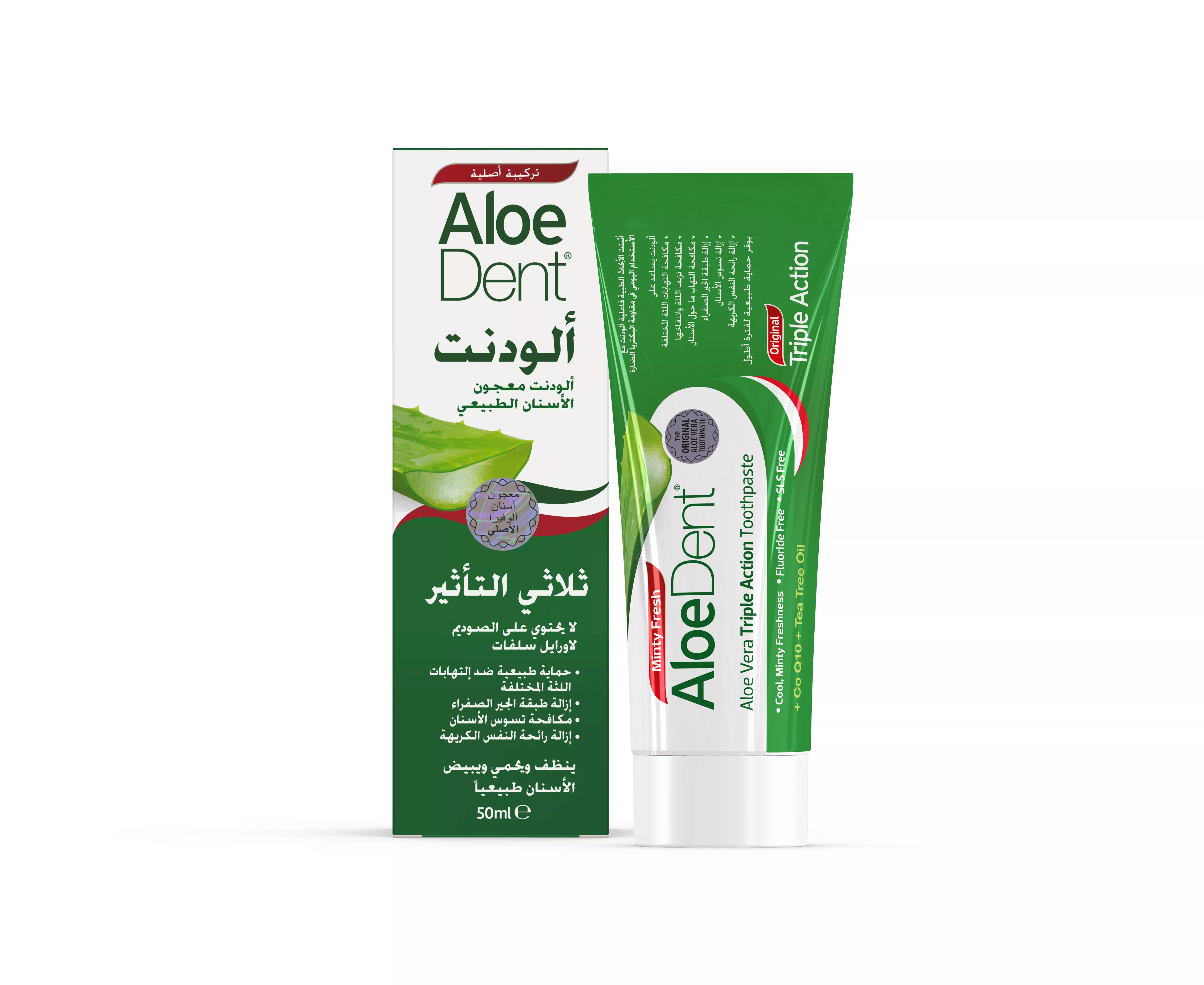 Optimas Triple Action Aloe Dent Aloe Vera toothpaste is createdto help your family with natural protection against plaque,tartar, cavities, bad breath and gum disease, and by been made upof some of natures finest ingredients, they have created a greatproduct. This Triple Action toothpaste is a natural basedfluoride-free toothpaste with a cool, minty taste. Brushingregularly with Aloe Dent Triple Action toothpaste offers afantastic triple action: cleaning and protecting your teeth andgums naturally. Our toothpaste is SLS free and has a fantastic natural minty flavour.