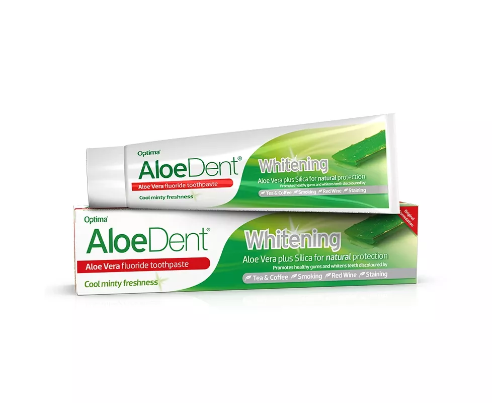 Brush twice daily with AloeDent Whitening Toothpaste for healthy teeth and gums.