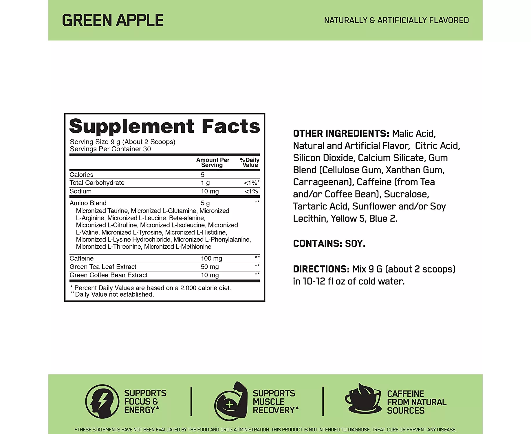Amino Blend (Micronized Taurine, Micronized L-Glutamine, Micronized L-Arginine, Micronized L-Leucine, CarnoSyn Beta-Alanine, Micronized Citrulline, Micronized L-Isoleucine, Micronized L-Valine, MicronizedL-Tyrosine, Micronized L-Histidine, Micronized L-Lysine, Micronized L-Phenylalanine, Micronized L-Threonine, Micronized L-Methionine), Malic Acid, Natural & Artificial Flavors, Citric Acid, Energy Blend (Caffeine, Green Tea Extract, Green Coffee Extract), Silicon Dioxide, Calcium Silicate, Gum Blend (Cellulose Gum, Xanthan Gum, Carrageenan), Sucralose, Tartaric Acid, FD&C Yellow #5, FD&C Blue #2