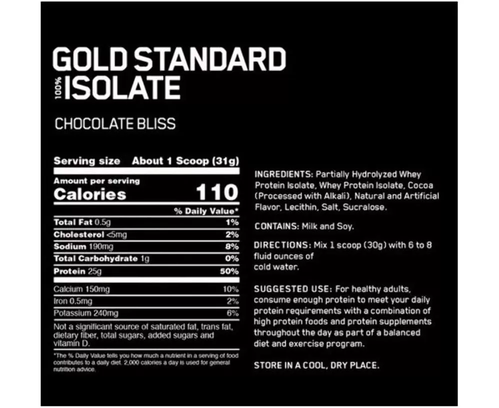 High Quality Hydrolyzed & Ultra-Filtered Whey Protein Isolate To create GOLD STANDARD 100% ISOLATE, we start by selecting only the highest quality whey protein which undergoes a series of sophisticated filtration processes to ‘isolate’ out excess fat, cholesterol and sugar. A portion of this Whey Protein Isolate is then hydrolyzed – broken down into smaller chains of amino acids. The final product is a fast digesting complete protein containing no more than 1 gram of carbohydrates, less than a gram of fat and more than 80% pure protein per Serving.