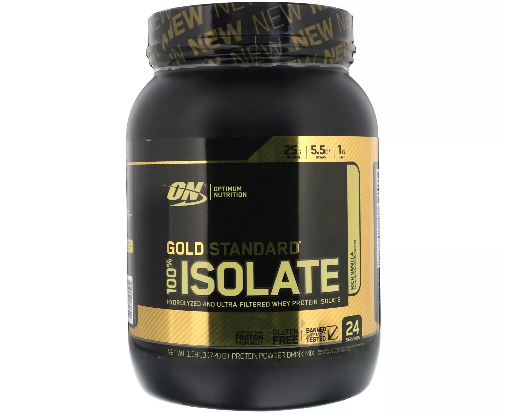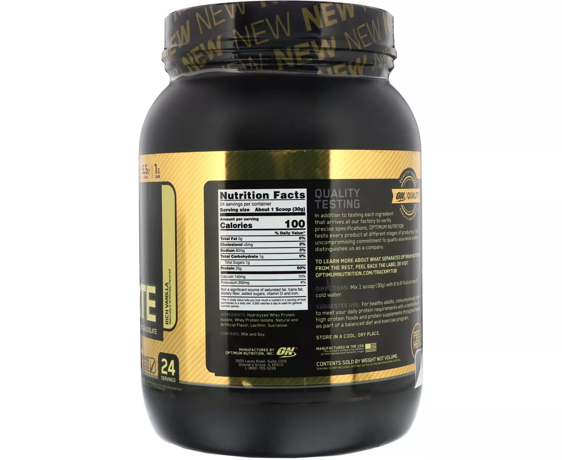 High Quality Hydrolyzed & Ultra-Filtered Whey Protein Isolate To create GOLD STANDARD 100% ISOLATE, we start by selecting only the highest quality whey protein which undergoes a series of sophisticated filtration processes to ‘isolate’ out excess fat, cholesterol and sugar. A portion of this Whey Protein Isolate is then hydrolyzed – broken down into smaller chains of amino acids. The final product is a fast digesting complete protein containing no more than 1 gram of carbohydrates, less than a gram of fat and more than 80% pure protein per Serving.